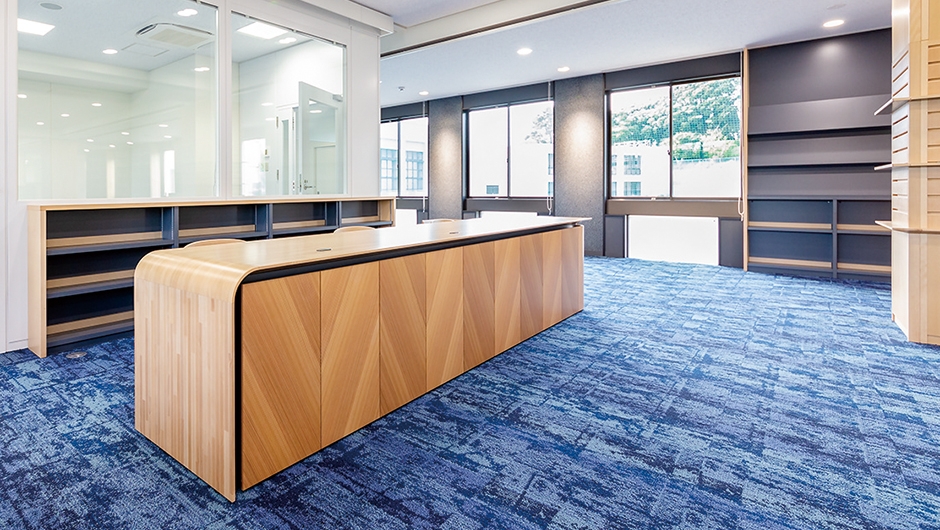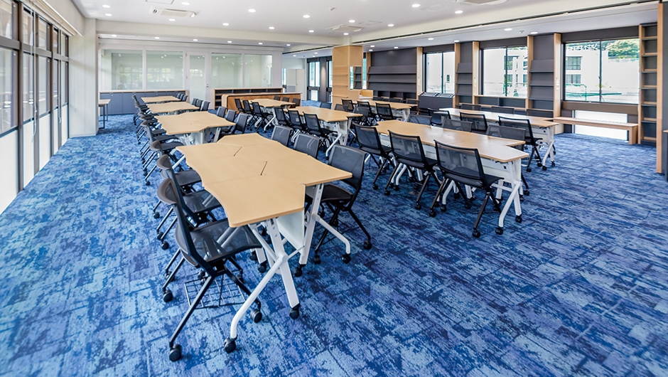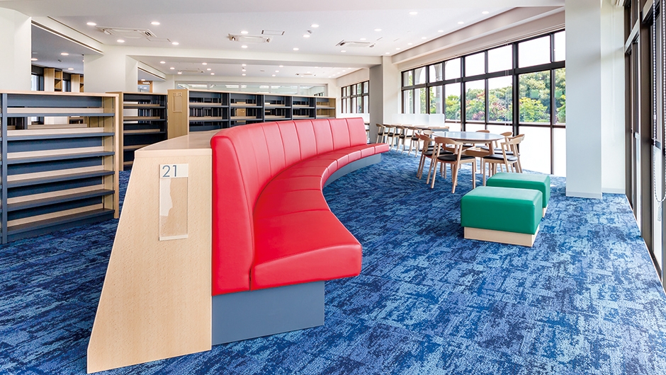 改修された図書室には移動性に優れたイス・デスクが採用され、アクティブラーニング型授業を実践することができるほか、新たに設置された大型の湾曲書架の前には、生徒同士がコミュニケーションを取ることができるソファや大型のテーブルが配置されており、モダンな図書室へと生まれ変わっています。
