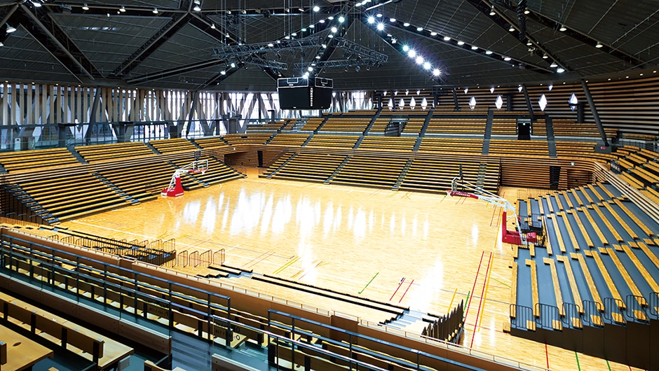 2012年に開館した大田区総合体育館は、京急蒲田駅から近く、第一京浜国道に面するという好立地にあります。狭い敷地に、プロスポーツ興行や公式大会などを催すメインアリーナと、区民利用に適したサブアリーナを持ちます。メインアリーナでは、プロスポーツ興行以外に市民スポーツなども行ないます。観客席の配置にはフレキシブルな対応が求められるため、固定席の他に移動できる観覧席が設置されました。