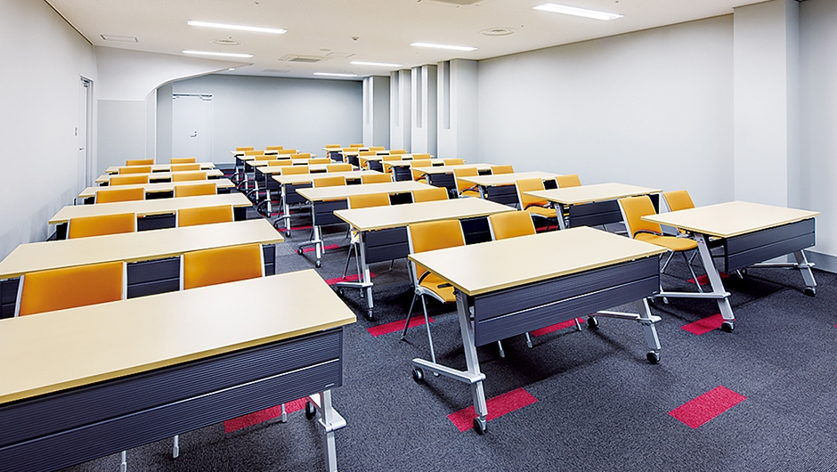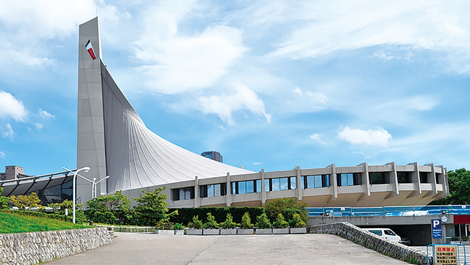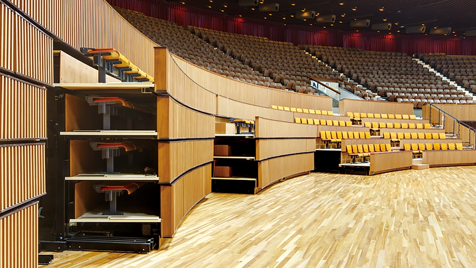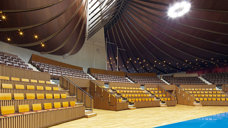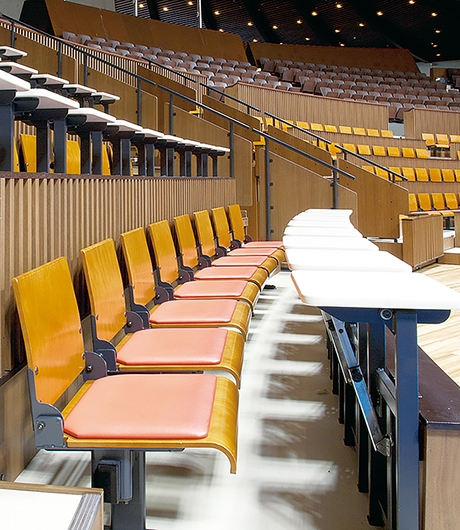バスケットボールやレスリング、バドミントン等、多様なスポーツに利用される第二体育館は、円形のアリーナを囲む2,888席のスタンド席を備え、さらにスタンド席の前部アリーナレベルに収納式の移動観覧席を設置しています。竣工から47年を経て、今回2度目の移動観覧席の入替えを行ないました。移動観覧席は314席あり、10のブロックに分かれ、アリーナの形に合わせた扇形の平面形状をしています。展開と収納は電動で行え、イスの背もたれは手動で折りたたみます。段床は、最前列を除き、高さが490mmあり、良好な視界の下、余裕を持った観戦が可能。また、各段の前面は、収納時に壁面と一体化する縦格子の化粧パネルで覆われ、アリーナの美観を損なうことのないしつらえとなっています。そのほか、記者用に着脱式のテーブルユニットが36席分用意され、必要に応じて取り付けができます。