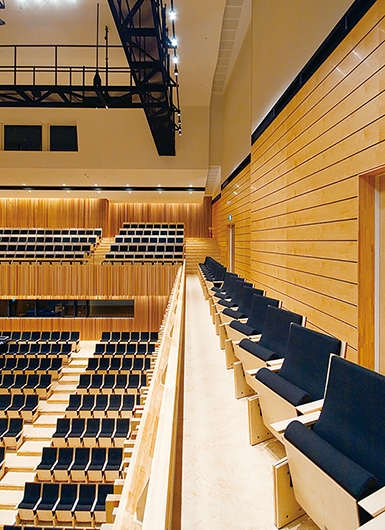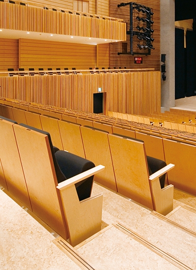 特注デザインのシートは、芯鉄板を合板で挟んだ側板のあしらいにより、すっきりとしたシャープな仕上げを実現。音響試験が行われ、使用感も追求されたシートとなっています。最前列や前列下手ブロックは、取り外しのできる移動席で、花道の設営なども可能です。