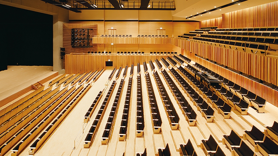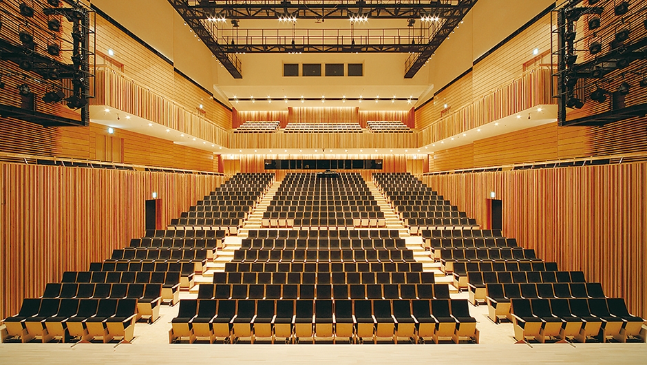 ホールは、コンサートから演劇まで幅広い用途に対応する多機能ホール。一般的な「劇場型」ではなく「シューボックス型」を採用し、音楽専用ホールに準じた性能が得られます。また壁面に配したリブなどにより、生の音の豊かな響きが醸成されます。一方、プロセニアム・アーチを持つ劇場型に転換可能な機構も備え、クラシック音楽から能楽や歌舞伎、中規模のコンベンションに至るまで多目的な利用が可能。自然環境と調和したデザインと下呂市にしかない独自性が特徴で、一階席を包み込むバルコニー席が舞台と客席の一体感を生み出しています。