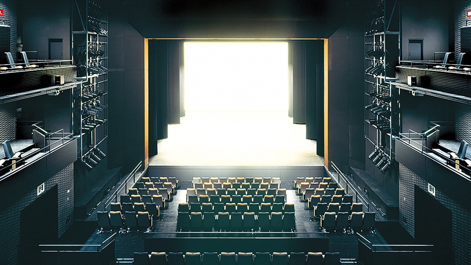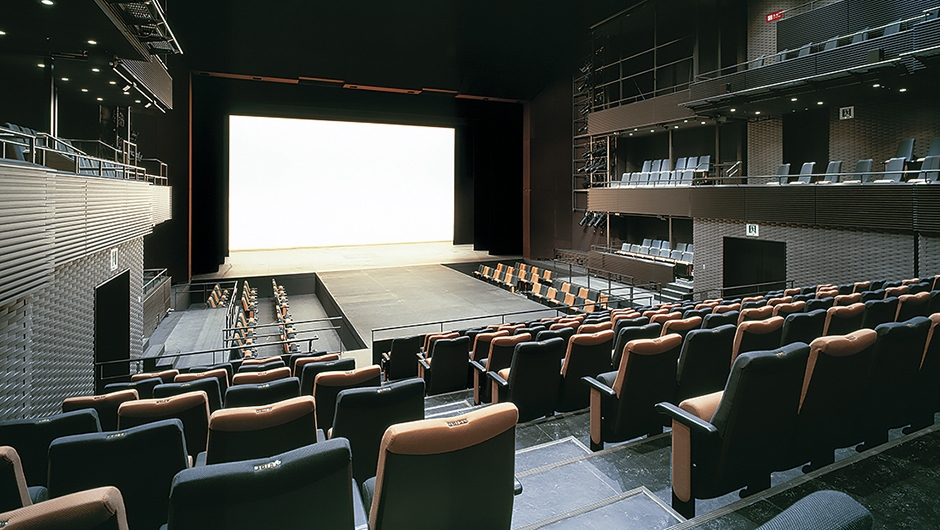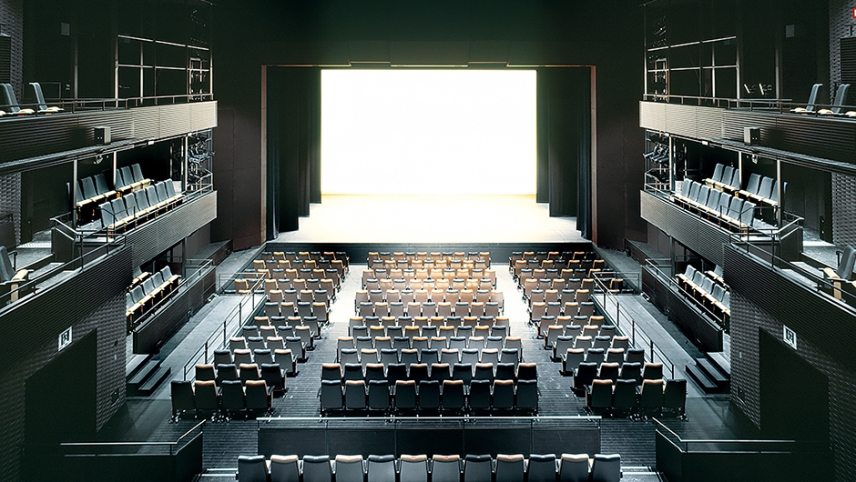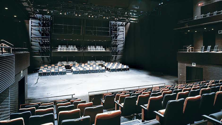 大ホールが音楽主目的の多目的ホールであるのに対して、この中劇場は、演劇主目的の多目的ホールとして位置づけられています。多様な用途・演出に対応するために、客席もプロセニアムの額縁も照明ブリッジも移動可能な画期的な機構を備えていて、プロセニアム形式、スラストステージ形式、ポディウム形式、能舞台形式等の様々な舞台設定が可能となりました。