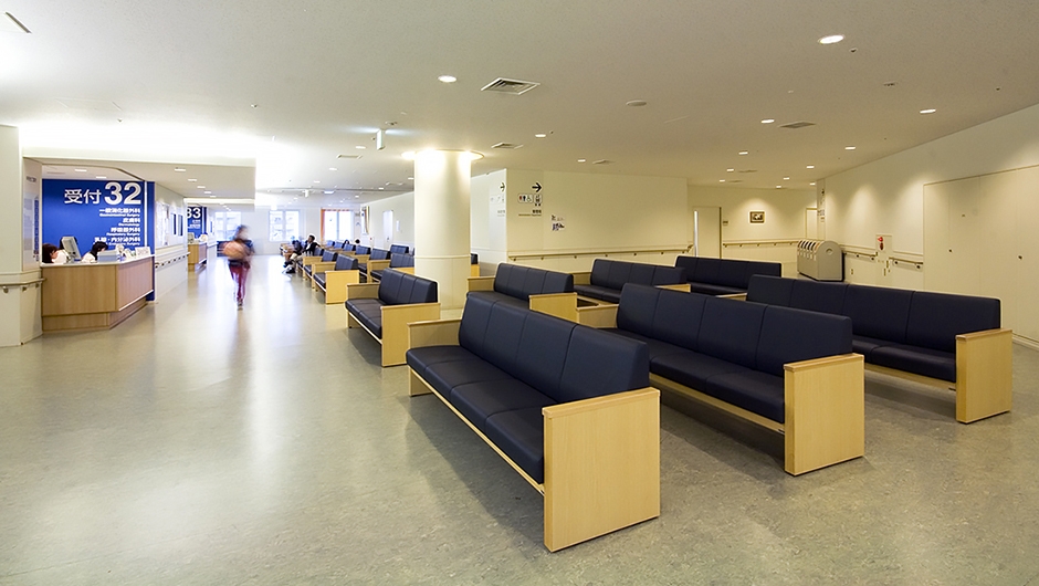 待合のベンチは特注品で、シンプルなデザインが落ち着きある空間を創出。背座は、1席ごとに取り外して張替えができ、パネル脚はメラミン化粧板貼りにするなどメンテナンス性にも優れています。また、様々な利用者を想定して安全性などの配慮もなされました。外待合や中待合など十分な空間とベンチが確保され、来院者の心のケアを支えています。