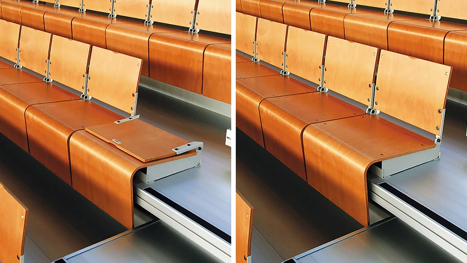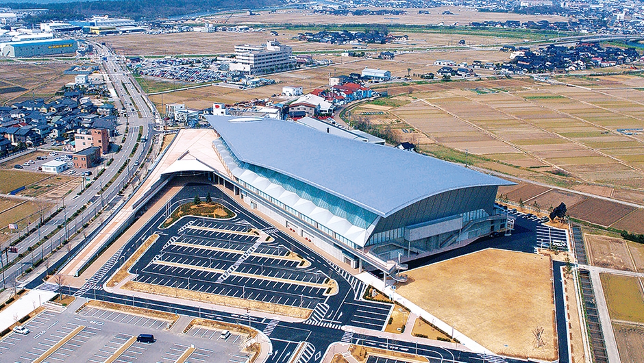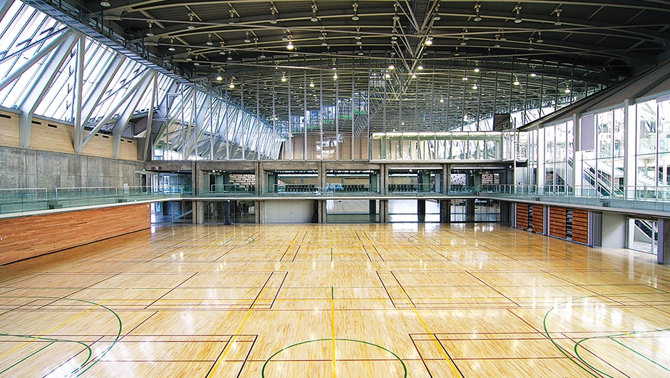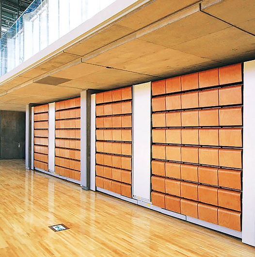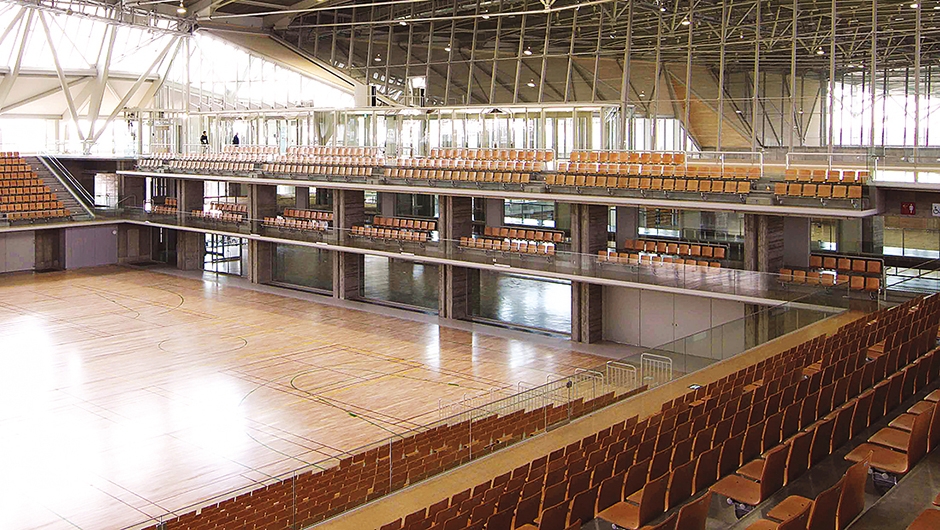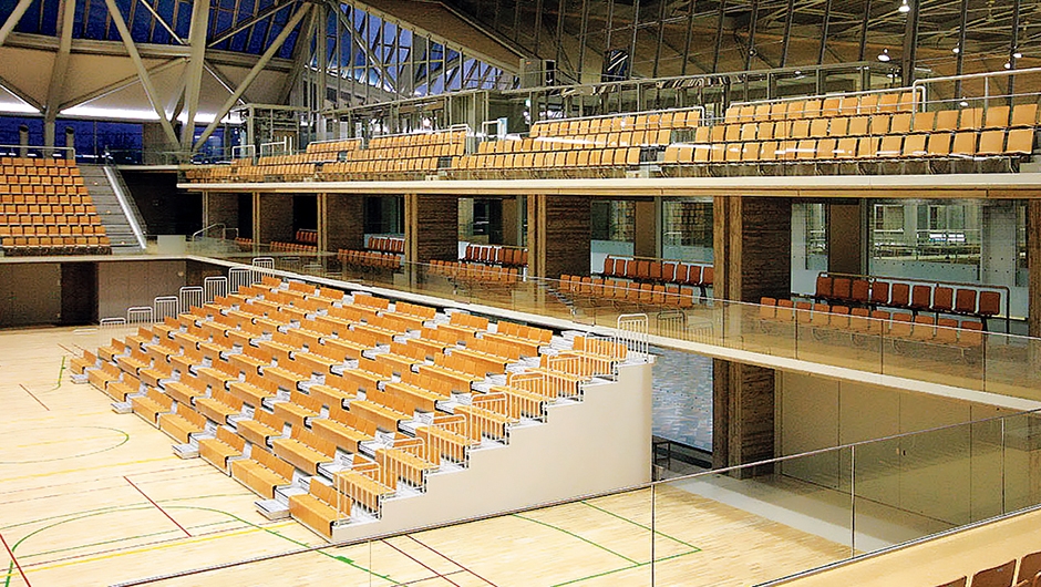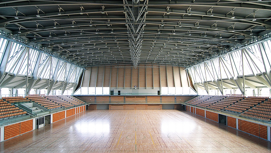 2008年4月にオープンした「いしかわ総合スポーツセンター」は、石川県におけるスポーツ振興の拠点施設です。日本海側では最大級のメインアリーナを備え、県民の活用とアスリートの育成を目指します。アリーナを単に競技をするだけの場とはとらえず、空間にやわらかいイメージを持たせるため、内壁と客席に木の素材を使用。移動観覧席の座にも木を使い、収納時にはかま部分が壁面仕上げとなることを想定して検討されました。メインアリーナでは、仮設を含め6,000人収容という条件があり、固定席が約2,800席、移動観覧席は2,152席とし、そのうちの744席を完全移動型としました。すべての移動観覧席を壁内収納型とするには、メインアリーナの壁面量が足りないため、完全移動型にすることでサブアリーナにも収納。両アリーナでの完全移動型観覧席の共有使用により、サブアリーナでの1,000人のイベントを可能にしました。