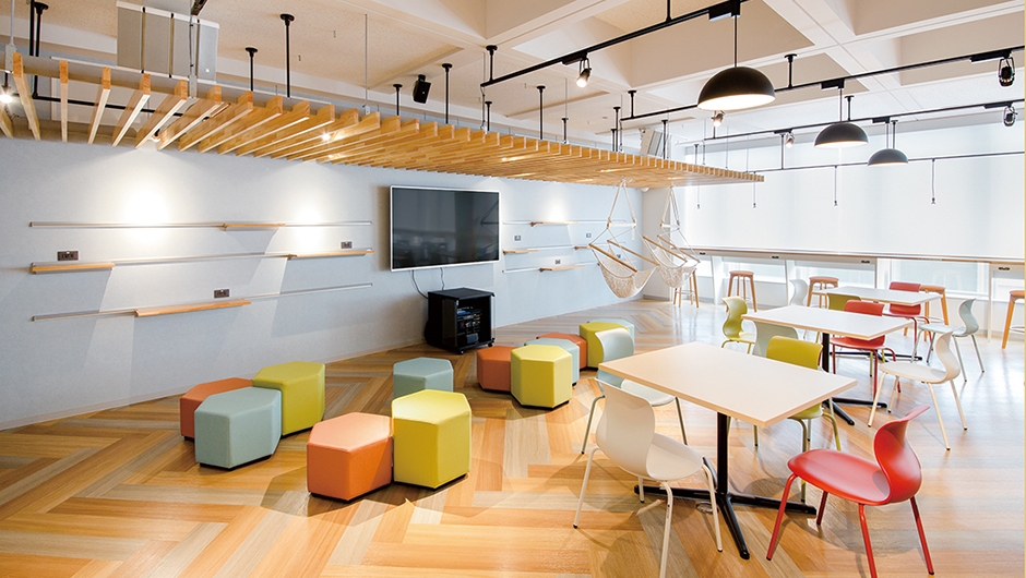 最上階の学生ホールには、壁面に大型ディスプレイが取り付けられており、休み時間やランチタイムなど多くの学生に利用されています。また全体をウッドテイストに仕上げ、ハンモックチェアを設置するなど、モダンなカフェをイメージした内装となっています。
