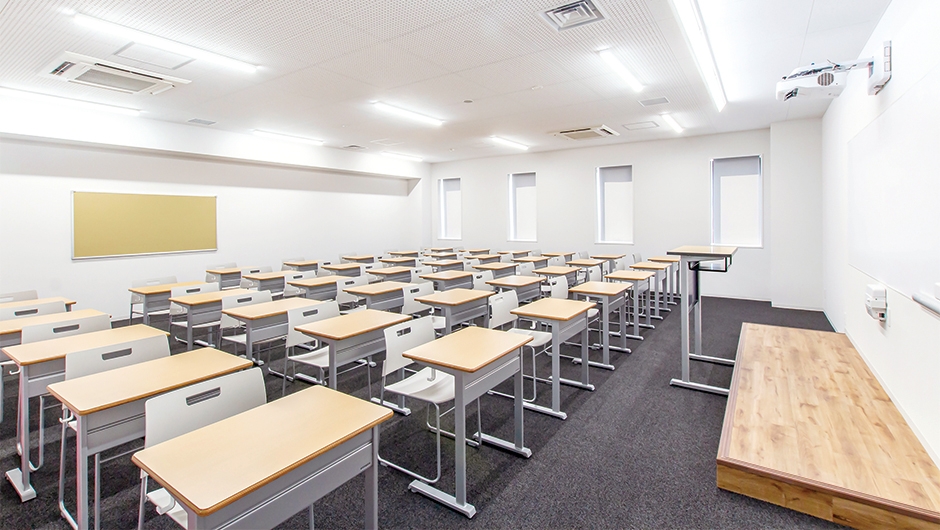 教室/イス:ペン、デスク:SCM-400L、教卓:S-30、掲示板、ロールスクリーン