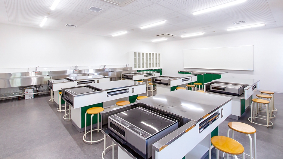 家政実習室/丸イス、調理台、壁面ホワイトボード、収納棚、食器棚、IHクッキングヒーター