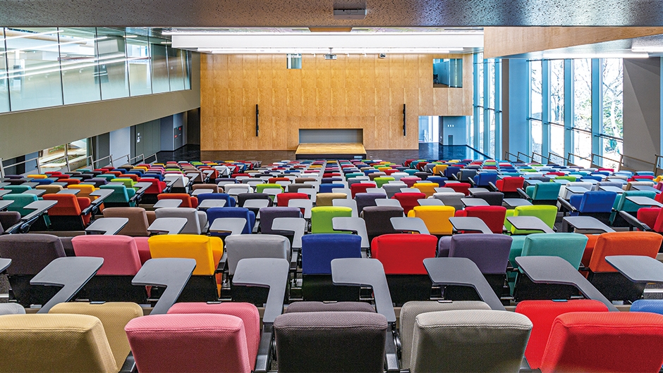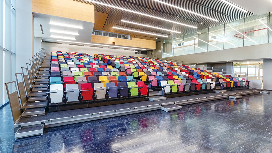 2021年3月、中央大学 多摩キャンパスに新しい学びの空間「FOREST GATEWAY CHUO」が竣工しました。講義室、演習室のほか、アカデミックライティングラボ、劇場型プレゼンスペースなど多様な学修環境を備え、学生や企業、地域の人々の交流拠点として、あらゆる「知」が集合・発信される空間となっています。また、ホールの移動観覧席は特定の色の座席に座ることでソーシャルディスタンスを保てる工夫が施されています。