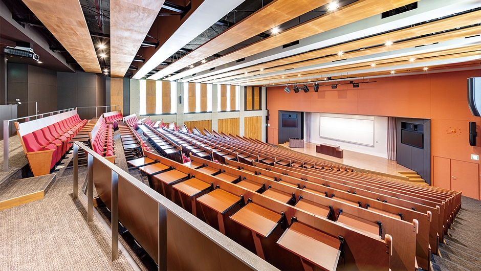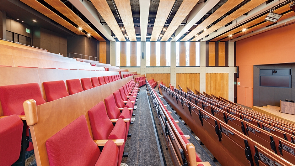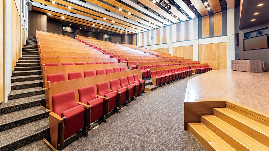 講義で利用されるほか、講演会や学外発表など大学の情報を発信する拠点となるAITADE HALLは、段床が約280mmと見通しが良く、落ち着いた空間となっています。