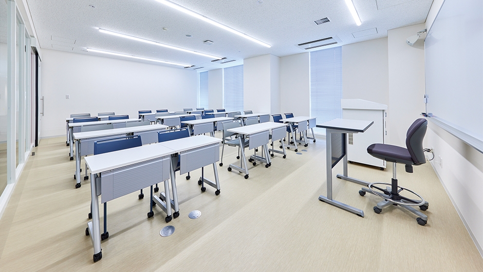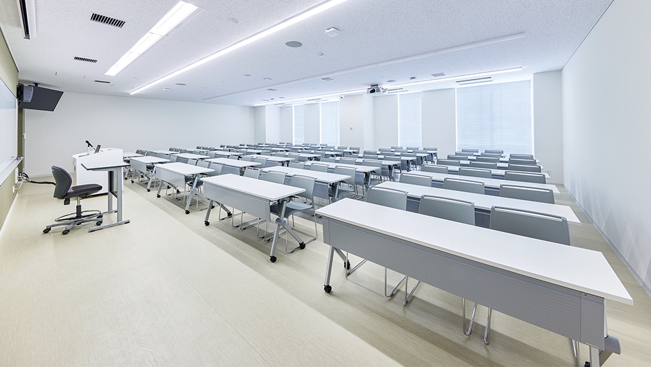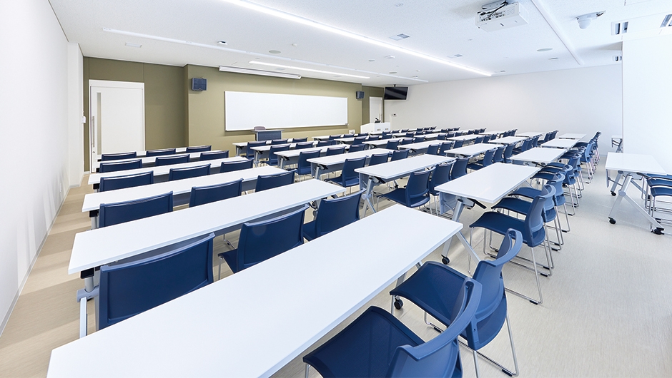 3階 中講義室〈1〉/講義デスク・イス:ラッセ、移動イス:SCM-4505/5105、移動デスク:CTN4特注品、教師用イス:AC-601、教卓:S-30