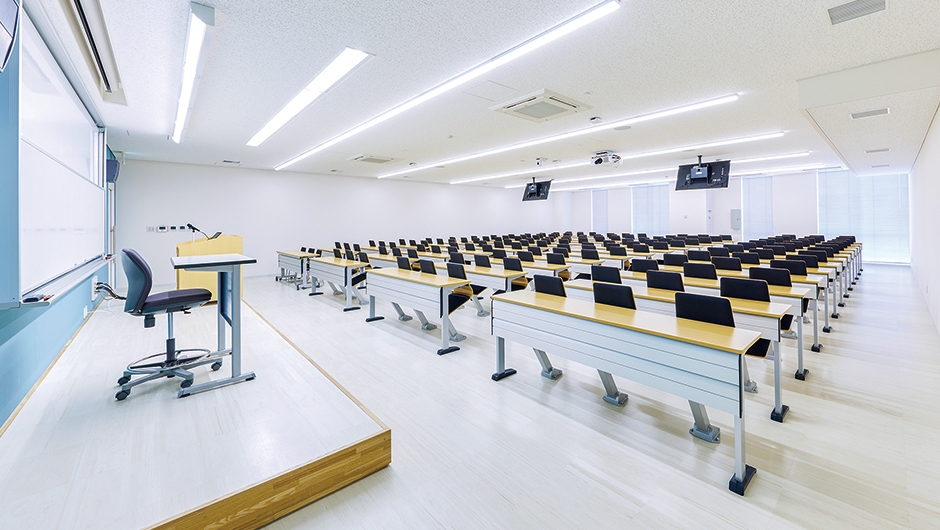3階 大講義室/講義デスク・イス:ラッセ特注品、移動イス:SCM-4505/5105、移動デスク:CTN4特注品、教師用イス:AC-601、教卓:S-30