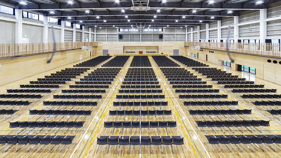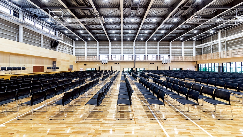 旧体育館は入学式・卒業式など主に式典を行う施設として活用していましたが、着工から約1年を経て完成した新体育館は、式典以外にも大学祭などのイベント活用や体育授業、クラブ活動などの体育施設機能を併せ持つ多機能施設となっています。多機能施設として使用する点を重視し、家具の移動や収納に優れた利便性を発揮する軽量のスタッキングチェアが採用されています。