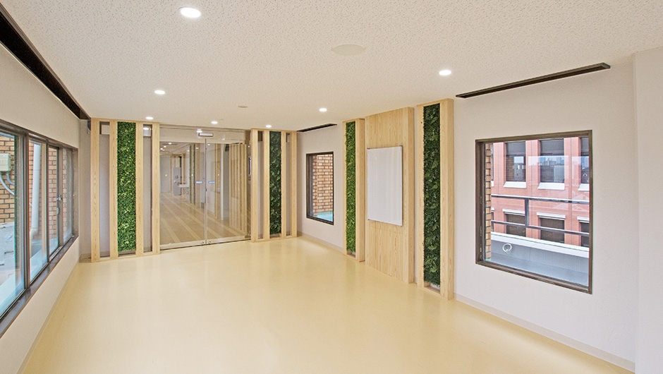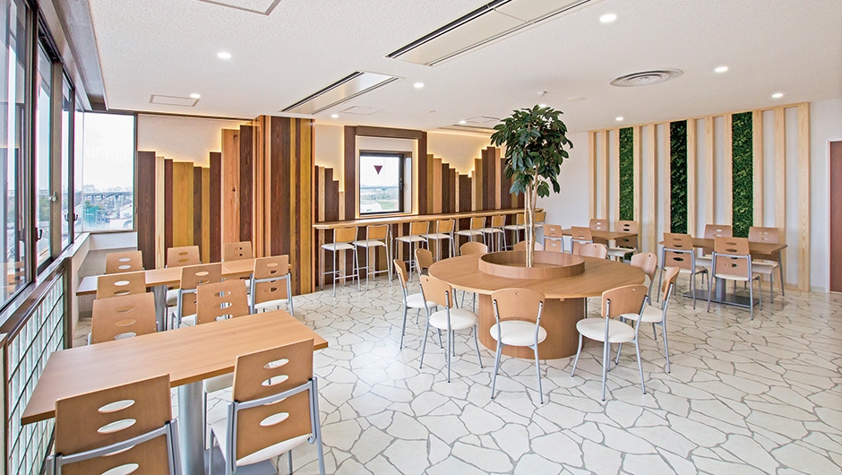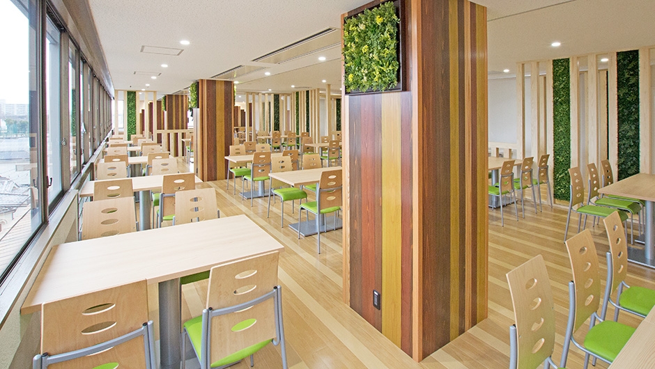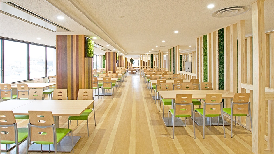 リニューアルされた食堂には、学園と連携協定を結ぶ奈良県川上村の吉野杉材が、壁面パネルや間仕切り柱などで使用されており、テーブルの表面材にも杉柄が用いられ、意匠の統一がなされています。また、食堂内には壁面緑化やシンボルツリーが設置されており、温かみのある空間へと生まれ変わりました。