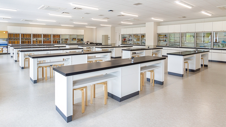 総合科学実習室/イス、教師用実験台:AS-EKA、生徒用実験台:AS-ESC、収納棚、流し台