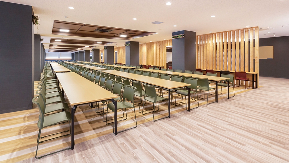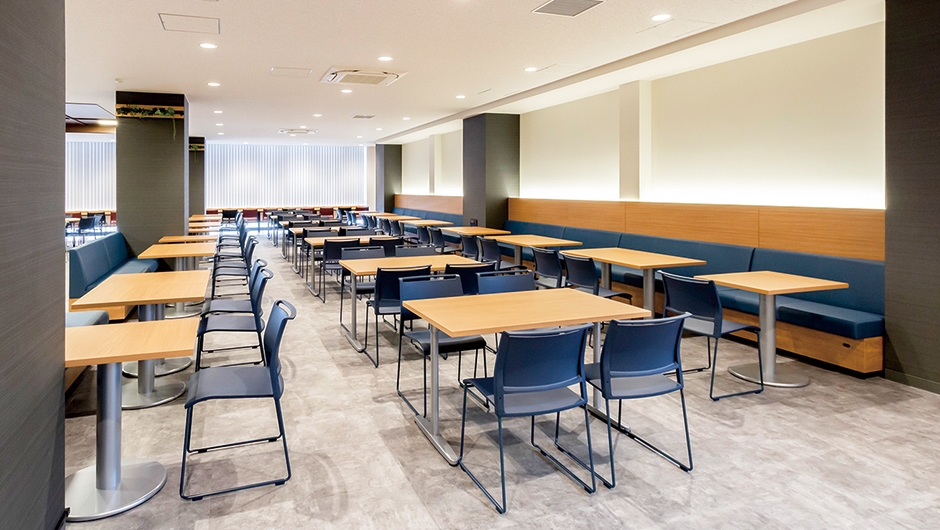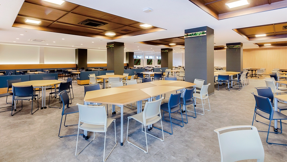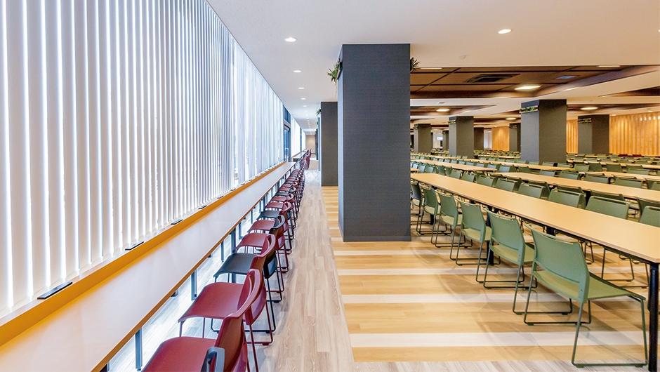 2号館には学生生活を送るうえで欠かせない各種施設が揃っており、1階の食堂には、グループエリアやカウンターエリアなど、利用者のニーズに応えられる様々な席が用意されているほか、カウンターテーブルにはコンセント(AC+USB)が装備されており、個人学習スペースとしても活用できます。