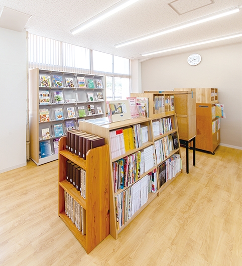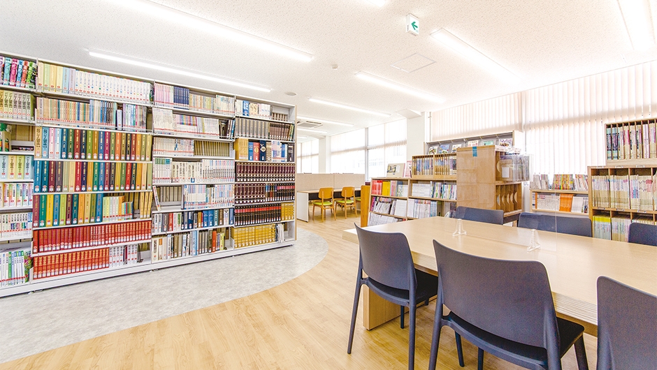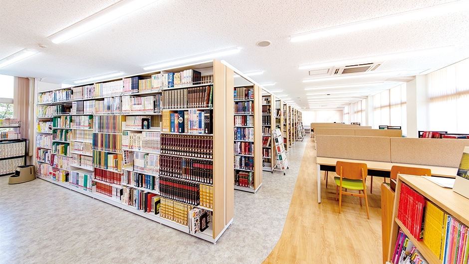 図書館には約54,000冊の蔵書のほか、雑誌コーナーやDVD閲覧コーナー、大型絵本などが揃っており、学生が自習や実習の準備に活用することができます。また、1フロア上には学生ホールと自習室があり、図書館の利用とあわせ交流・学修の場となっています。
