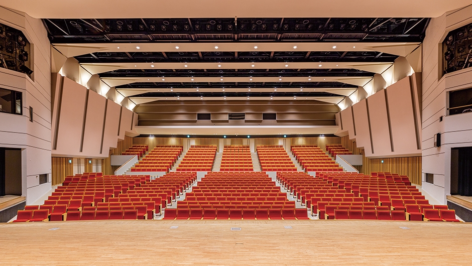 開館から50年近くが経過し、施設の老朽化が進んでいた中津川文化会館で改修工事が実施され、2020年12月にリニューアルオープンしました。改修工事ではホール内の特定天井の耐震化工事、バリアフリー化のほか、客席の更新を行いました。更新に伴い、客席の幅は改修前より50mm広げ、ゆったりとした座り心地となったほか、中央の座席は千鳥配置にすることでステージが見やすくなり、快適に鑑賞できるホールへと生まれ変わりました。