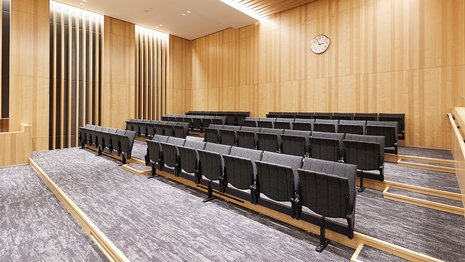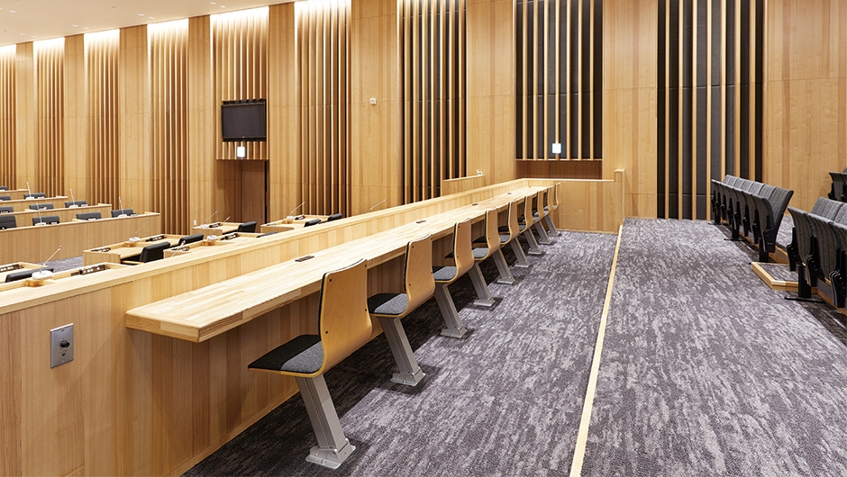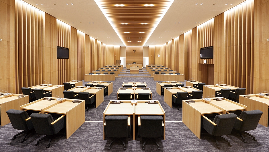 6階 議場/議場イス:RC-2200W、傍聴席:ミンゴα、議場イス:RC-2200W、記者席:SCF-5105C