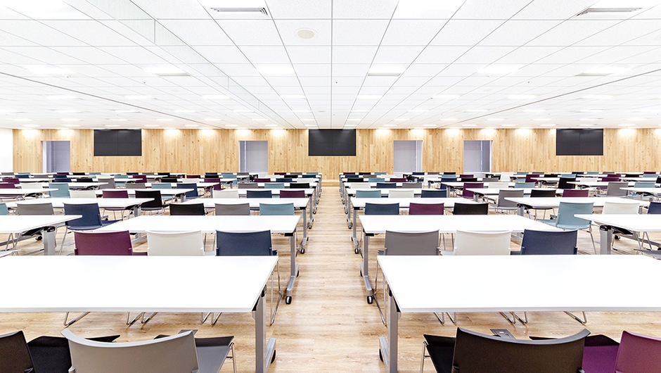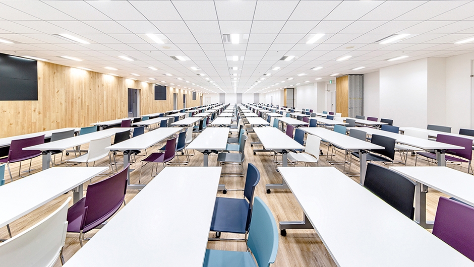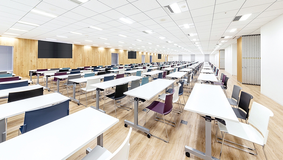 株式会社ネクステージは名古屋市に本社を置き、北海道から九州まで全国に店舗を構え、車両の販売をはじめ、車用品・付属品の販売、自動車保険、整備・点検・車検、車の買取まで、トータルにカーライフをサポートするビジネスモデルを展開しています。事業拡大に伴い、人材の採用や教育に積極的に取り組んでおり、説明会や面接、会議、研修をいつでも柔軟に開催できるよう、本社付近に拠点を開設しました。テーブルは3人掛けでもゆったりと利用できるように天板幅が1900mmあり、また長時間の利用にも適した快適性の高いイスが採用されています。
