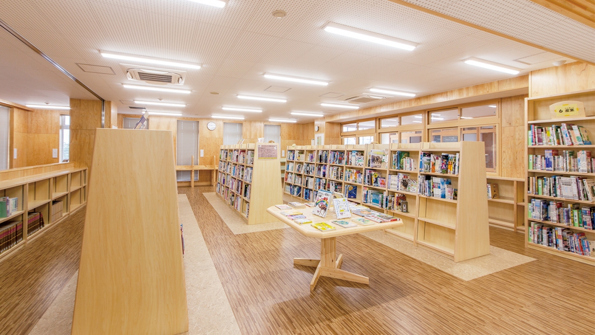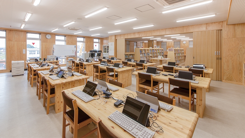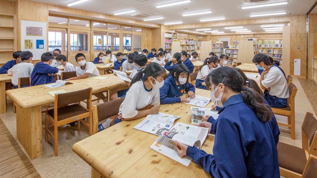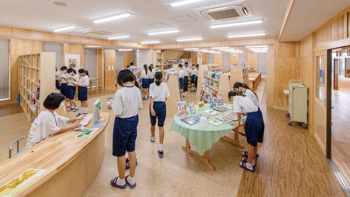 豊田市では豊田市子ども読書活動アクションプランに基づき、「読書に親しむ機会」とともに、「本の活用能力を身に付ける機会」の創出を目指し、学校図書館における調べ学習の充実を目指しています。2021年春に完成した新校舎のメディアセンターは、2階から3階にまたがっており、多くのクラスルームからアクセスがしやすくなっています。また木質系の内装でまとめられた広い館内には、充実した蔵書と、2クラス分の調べ学習のエリアが設けられており、本に親しむための優しい雰囲気と、学習に必要な機能を両立しています。
