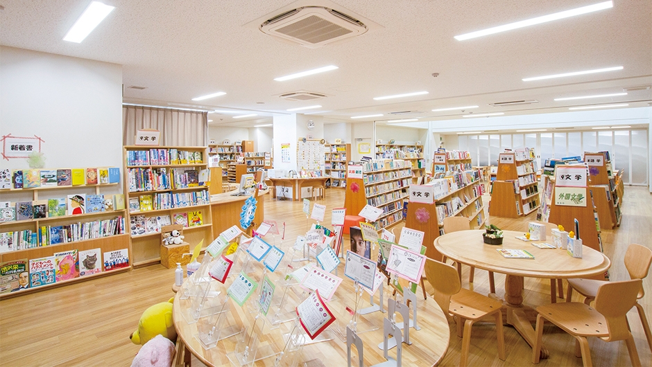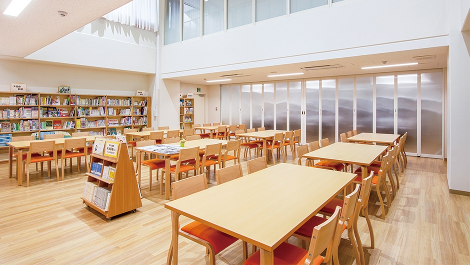 校舎の建て替えに伴い一新された図書室は、光庭に面した、吹き抜けからの光が取り入れられた明るい空間になっています。また、平湯モデルが採用されており、木の温もりを感じることができる図書室へと生まれ変わりました。
