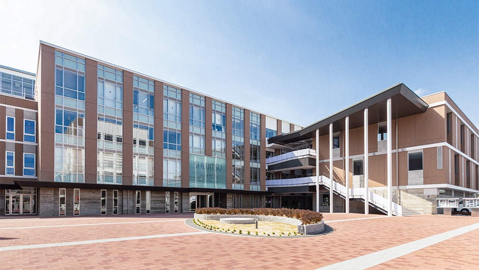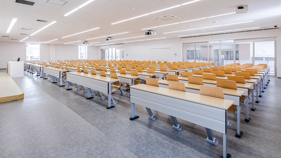 2021年3月、キャンパスの新しいシンボルとなる新校舎A・D館が竣工しました。新校舎には、学生が自由に活用できるオープンスペース「ひかりてらす」、先進のICT教育環境が完備された情報教室が設置されているほか、D館の各階には283名収容可能な大講義室が3部屋設置されており、大人数の講義に対応するとともに、一般市民を対象にした公開講座などにも活用されます。