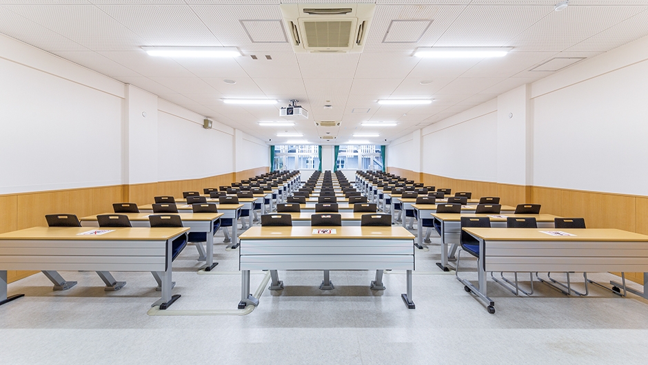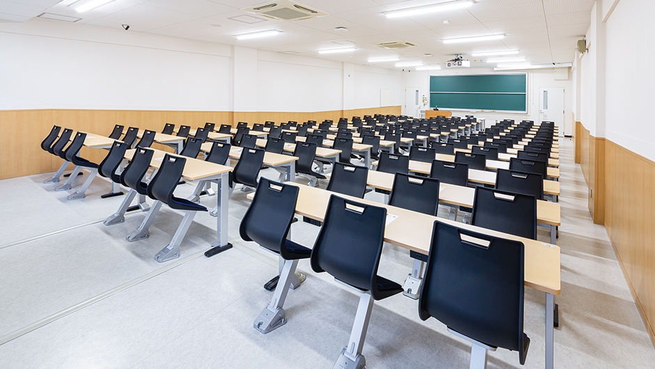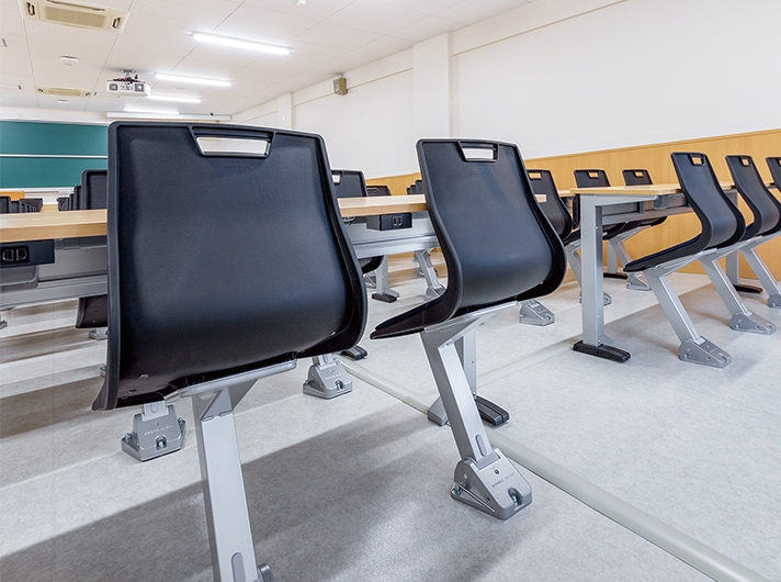 1階の講義室では講義デスク・イスが入れ替えられ、これまでの5人連から3人連のレイアウトに変更したことで、中央部の座席にもアクセスがしやすくなったほか、前方通路タイプから後方通路タイプへとしたことで、広い通路が確保されました。天板下にはACコンセントが装備されており、ノートパソコンやタブレットを充電しながら受講することができるようになっています。