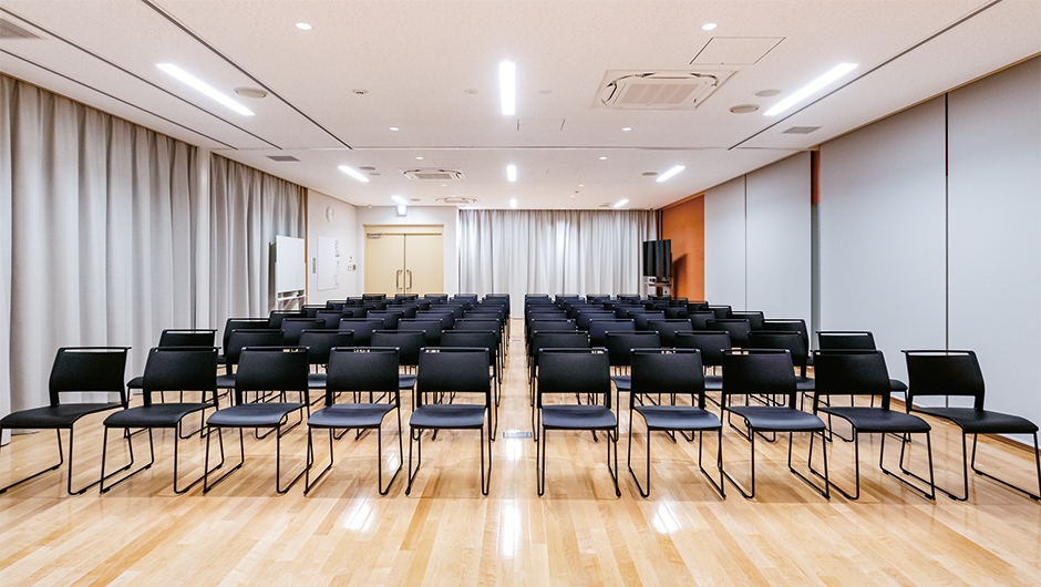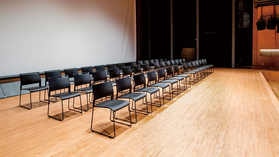 ホールや体育館のほか、様々な用途で利用することができる各種スタジオなどが備えられており市民の活動拠点となっています。外壁は公民館裏手を流れる大川沿いの桜や夕暮れ時をイメージして、朱鷺系の配色で統一されています。