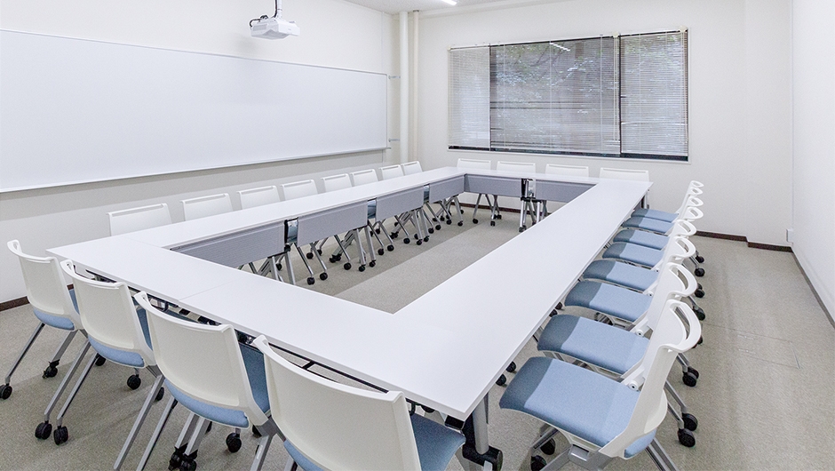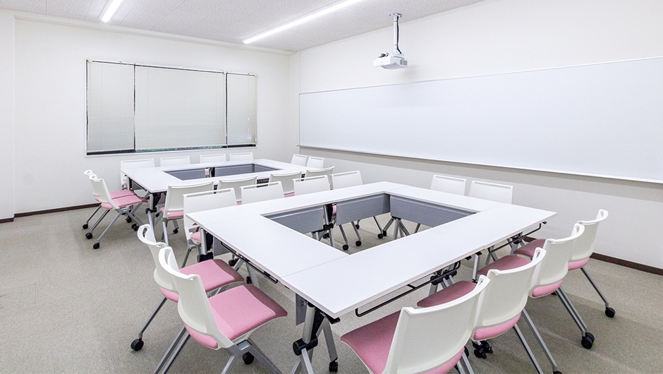 1階 演習室/イス:ティーポ、テーブル:フリプト、映写兼用ホワイトボード、プロジェクター