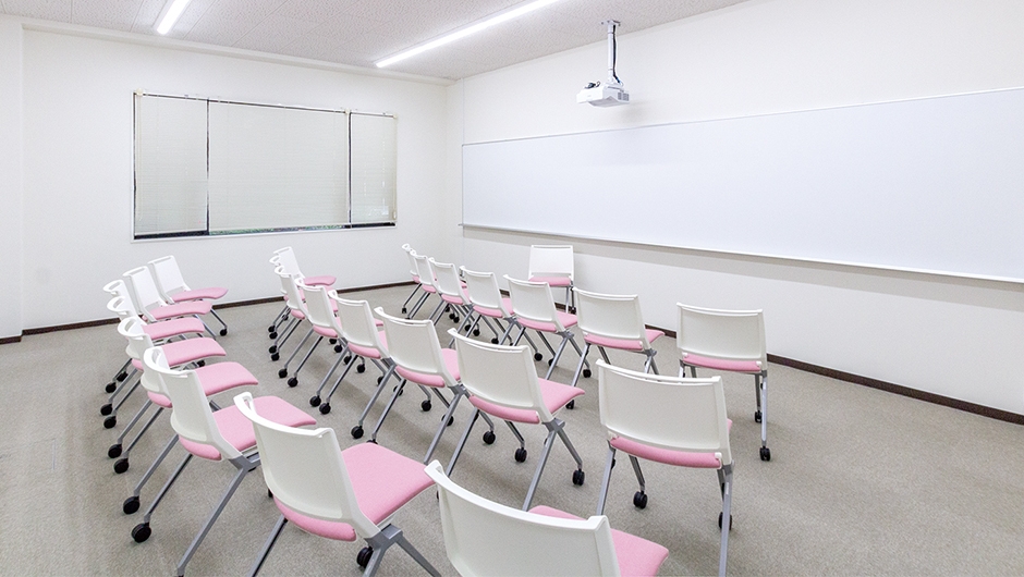 神戸松蔭女子学院大学では実践的能力を身につける教育環境の充実を目指し、自習スペースの増設をはじめ、普通教室のICT機器の整備、アクティブ・ラーニング対応教室の整備を進めています。7号館では、PC使用を前提とした自習スペースと演習室の改修がなされ、プロジェクターの設置・改修、可動イス・デスクへの入れ替えが実施されたほか、卓上でAC電源が使用できるように整備されました。明るく生まれ変わった自習スペースは、リモート授業や面談など多目的に使用されているほか、学生が授業の合間を過ごすスペースとしても活用されています。