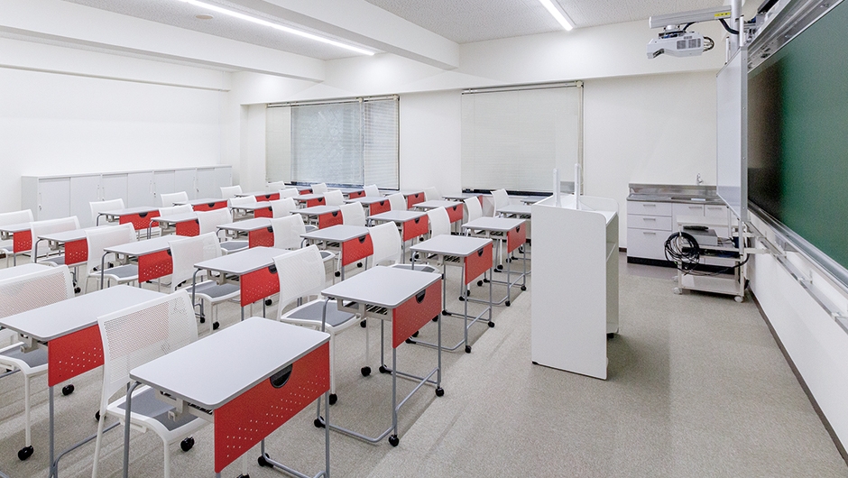 1階 教室/イス:ルッシュ、デスク:タクト、教卓、黒板(映写兼用移動ホワイトボード付)