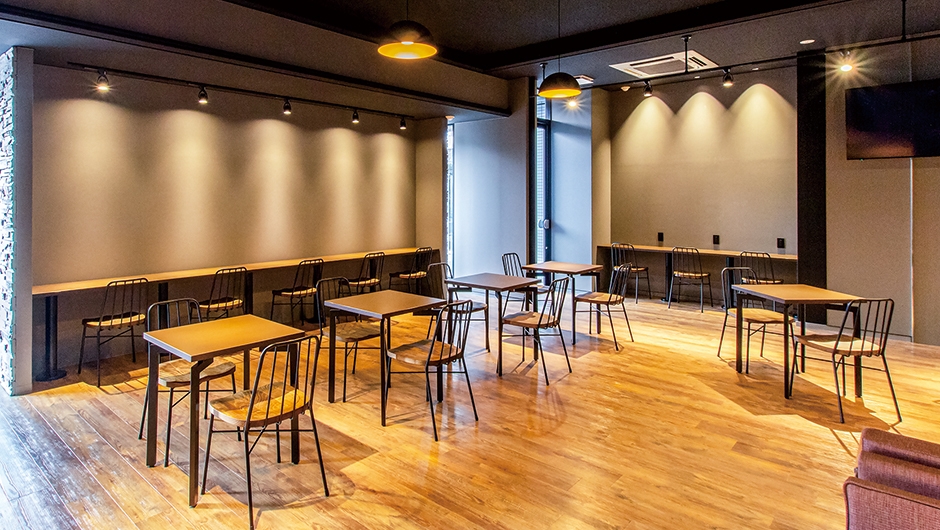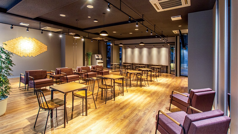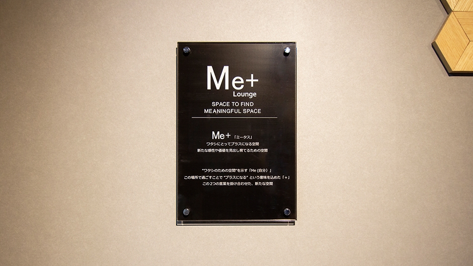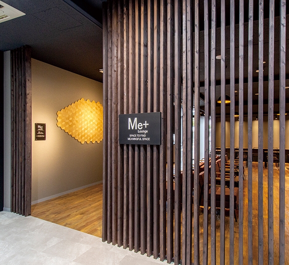 Me+(ミータス) Lounge/イス、テーブル、ラウンジチェア、サイドテーブル、内装改修(壁、床、天井、照明、壁面装飾パネル、木製ルーバー、サインパネル)