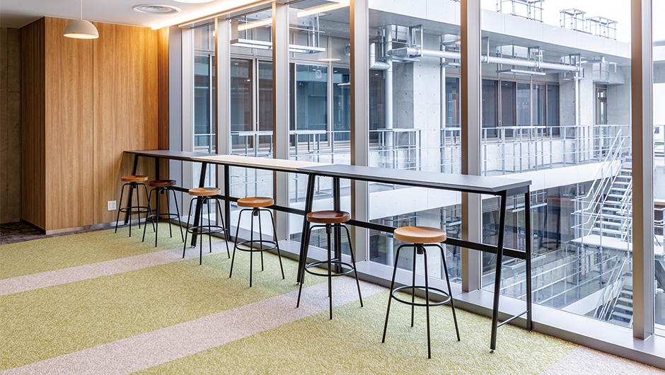 研究実験棟Ⅳには、理工学部の研究室・実験室・演習室のほか、低層階にはキャンパスアプローチに面する学生ホールや開放的なラーニングコモンズ、全学共用の講義室が設置されています。広がり感のある天井デザイン、ウッドデッキや磁器質タイルなど、利用者が居心地の良さを感じられる空間となっています。