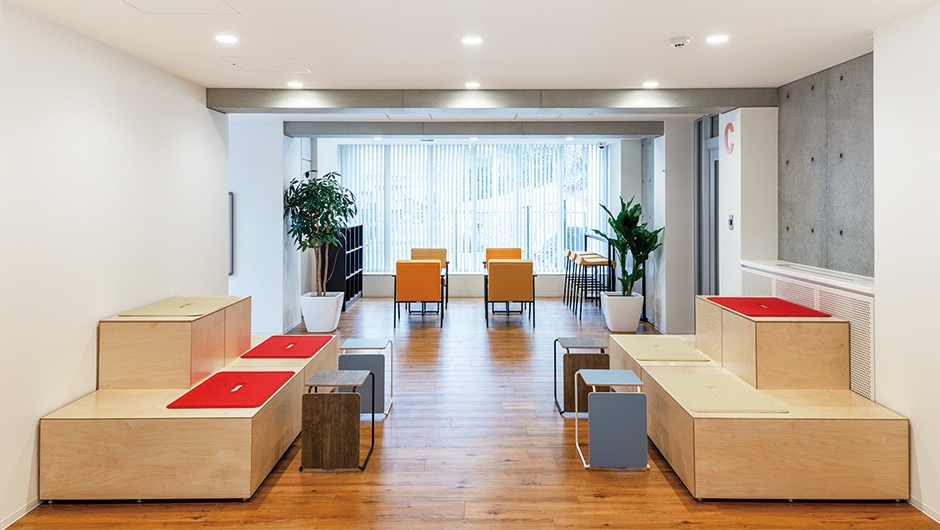 2階 共用リビング/イス、スツール、ハイチェア、ベンチ、テーブル、ハイテーブル、シェルフ、観葉植物、ブラインド