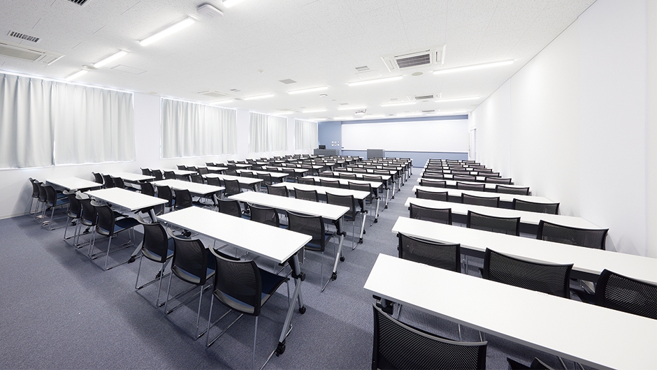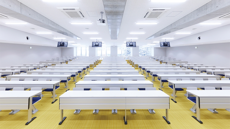 多様な学びのスタイルに対応する高い機能性を兼ね備えた大・中講義室には、コロナ禍で急速に需要が高まったハイフレックス型授業に対応できる最新のICT機器が完備されています。そのほかフレキシブルに教室内の設備や広さ等を変えられるなど、アクティブラーニングにも対応した講義室となっています。