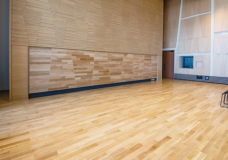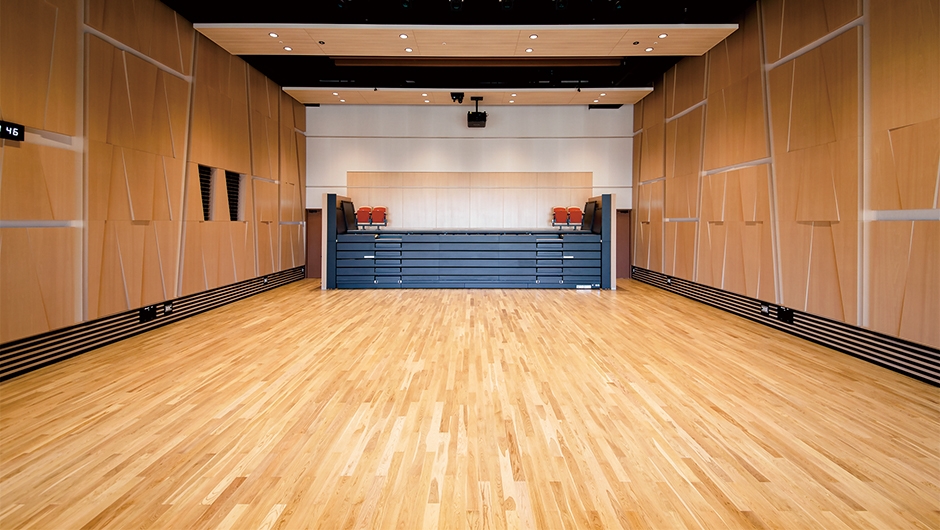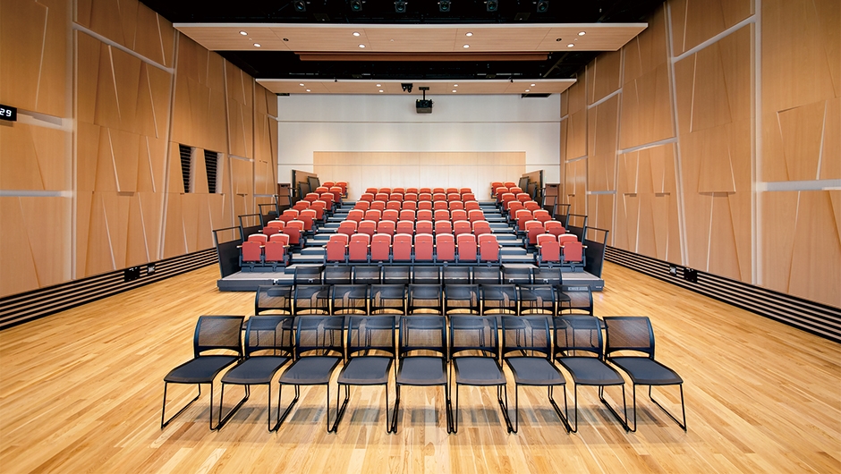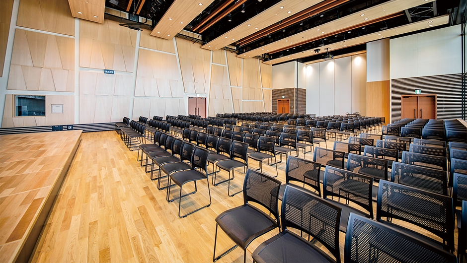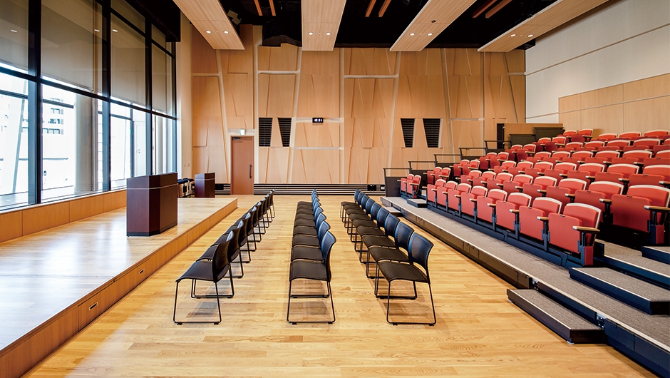 最上階に整備された大小2つのホールには、収納可能な移動観覧席、収納性の高いスタッキングチェアが採用されており、2つのホールを同時に利用した大型催事や、セミナー、展示会など幅広い用途に対応することができます。また三田図書館との複合施設であることから、映画上映会や読書イベントなど、図書館と共同利用することも想定されています。
