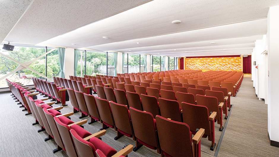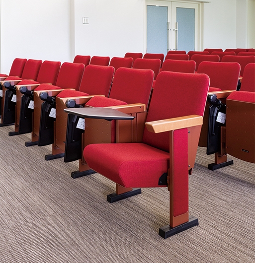 小講堂は、部活動や同好会の講演・発表会のほか、客席にはタブレットテーブルが装備されており、講演会等の学内行事など幅広い用途で利用されています。また、今回の入替えで座席幅が450mmから500mmに拡大され、ゆったりと利用できるようになりました。