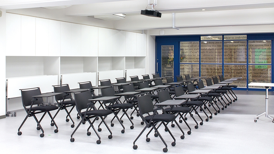 「授業内容の説明」から「実機(ロボット)の組立・プログラミング」、「プレゼンテーション」や「動作確認」といったプログラミングの授業における一連の流れを、その日の授業内容に応じて柔軟にレイアウトの変更ができるよう、移動性・収納性が高い家具が採用されています。