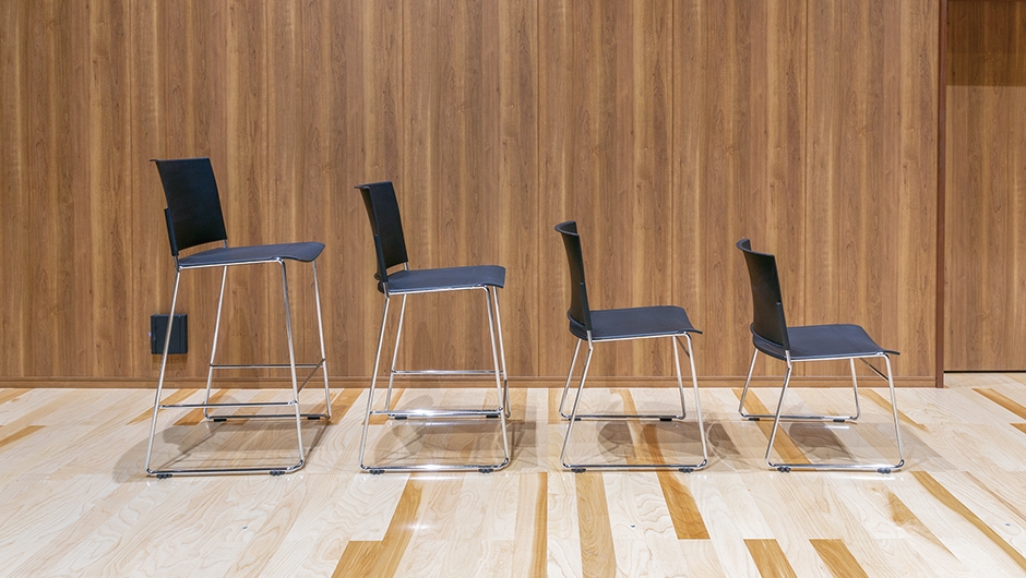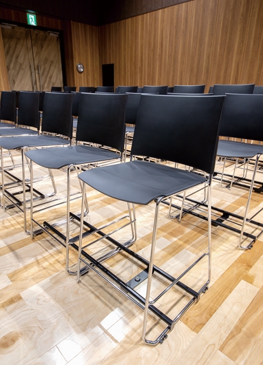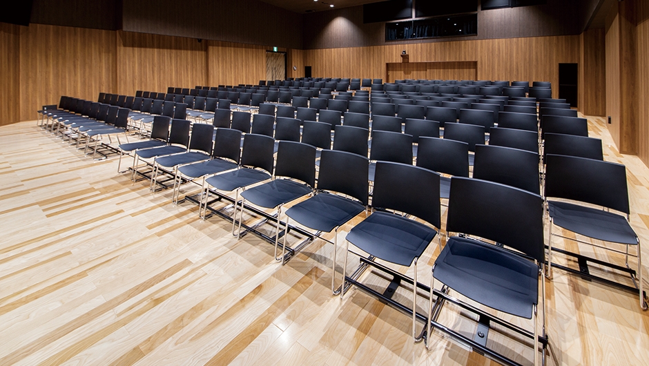 客席にはスタッキングチェアが採用されており、コンサート開催時にはイスを床に固定して利用。後列になるにつれて座面高の高いイスが配置され、後ろの客席でも十分な視界が確保されています。またステージから観客の距離が近く、奏者の息遣いを感じることができるホールとなっています。