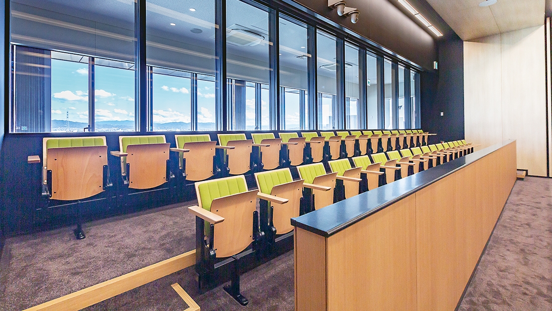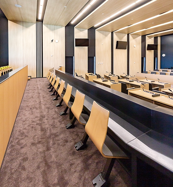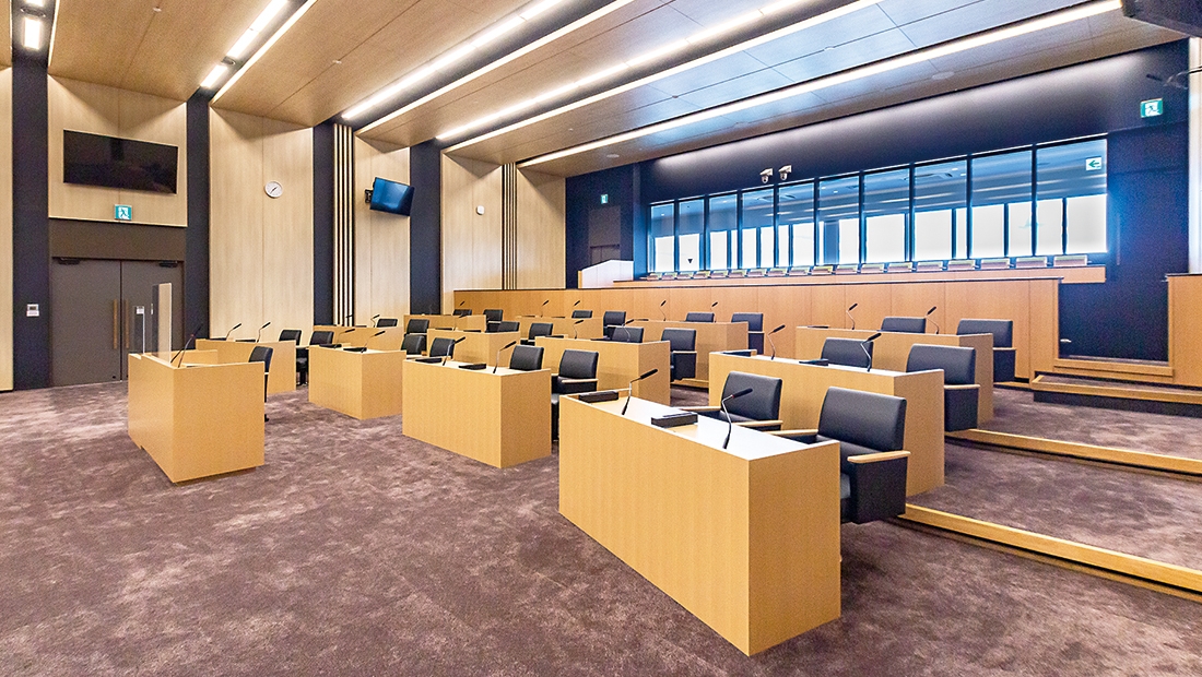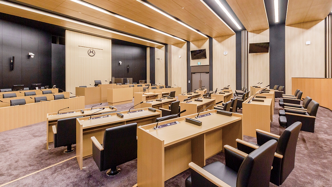 6階 議場/議場イス:RC-2300W、議場机、その他議場家具一式、傍聴席:ミンゴα、記者席/イス:ラッセ