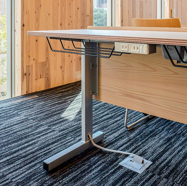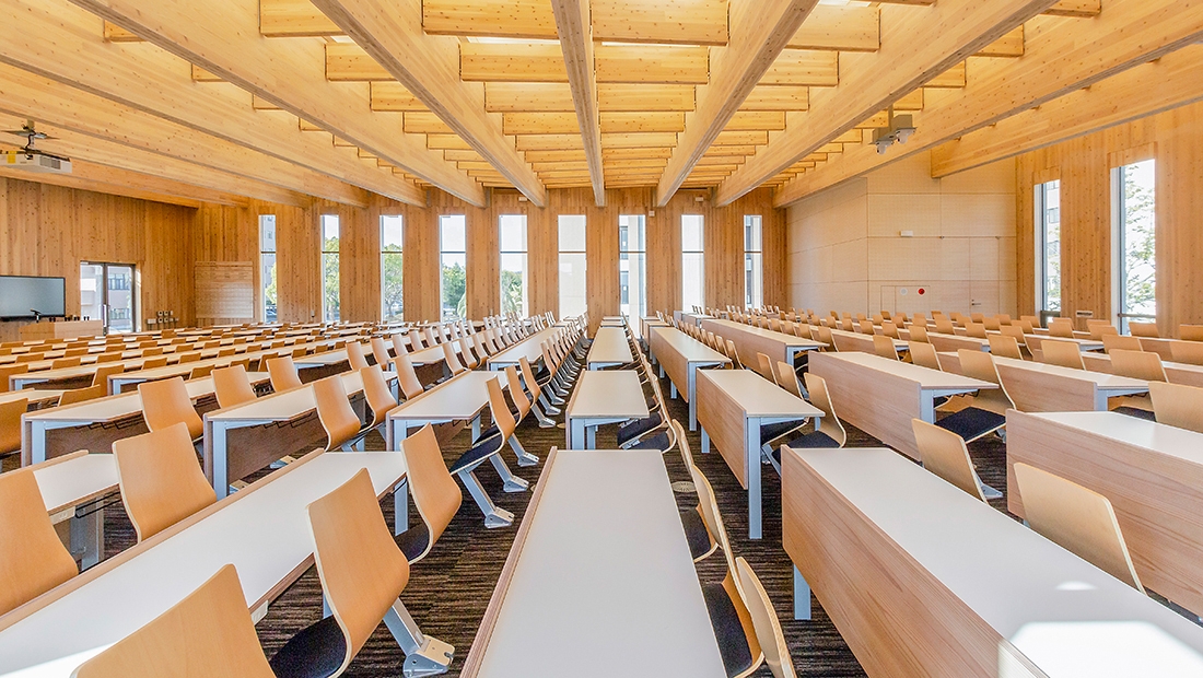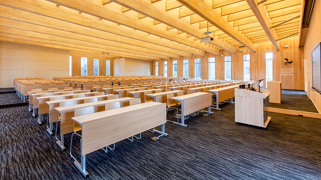 セミナーやシンポジウムなどのイベントにも活用可能な大規模講義室は、デスクの幕板がスギ突板貼となっているほか、CLTを使った梁見せ構造の天井になっており、木造建築の教材としても活用されます。