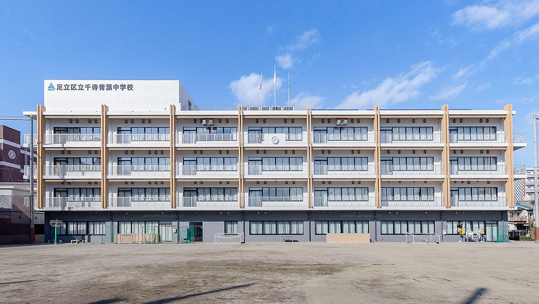 校舎の老朽化に伴い、改築工事を実施していた足立区立千寿青葉中学校の新校舎が完成し、2022年1月より供用を開始しました。