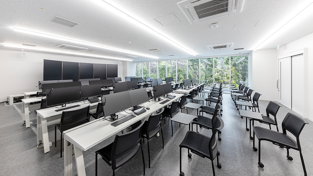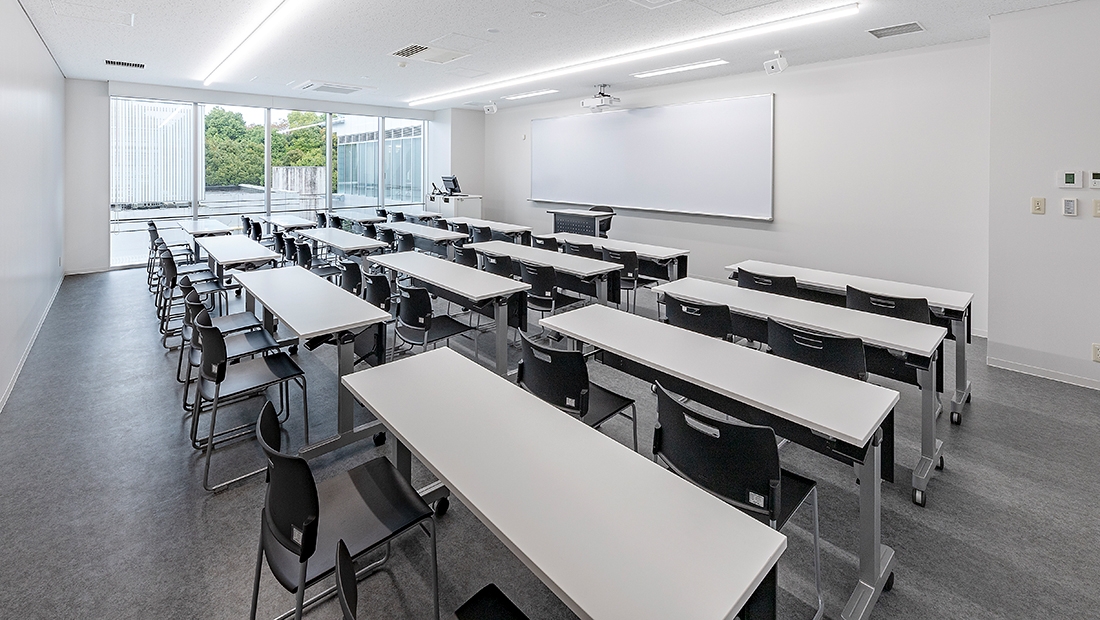 教室棟の内装は過度な装飾は避け、モノトーンを基調としたスタイリッシュなデザインになっており、学生一人ひとりが創意工夫して活用できるフレキシブルな空間で、主体的な学修姿勢やメンタリティを培うことができる学びの場となっています。
