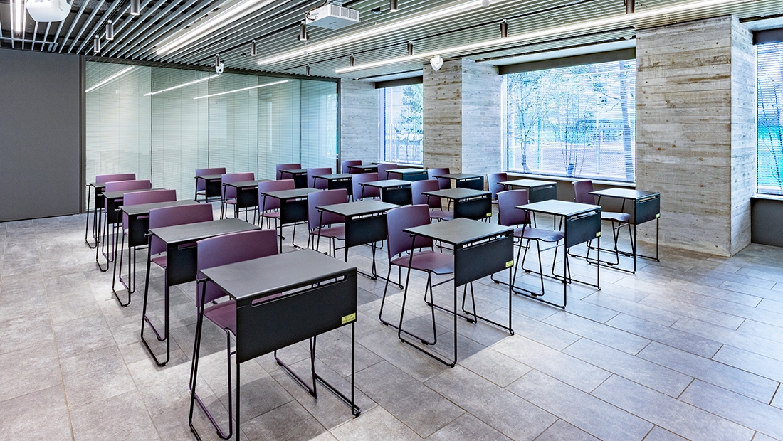 1階に設けられた学修や課外活動関連行事などで利用できるイベントスペースには、フレキシブルにレイアウト変更ができるよう、移動性・収納性が高い家具が採用されています。