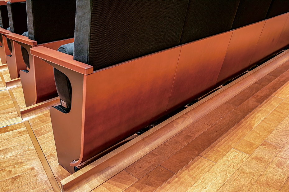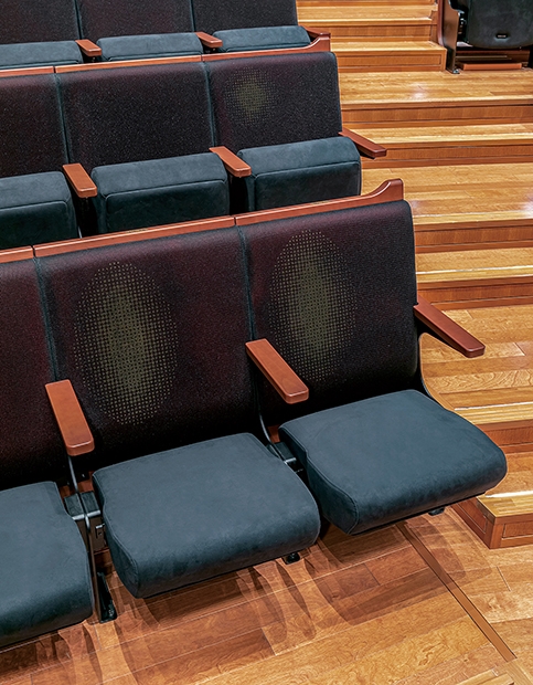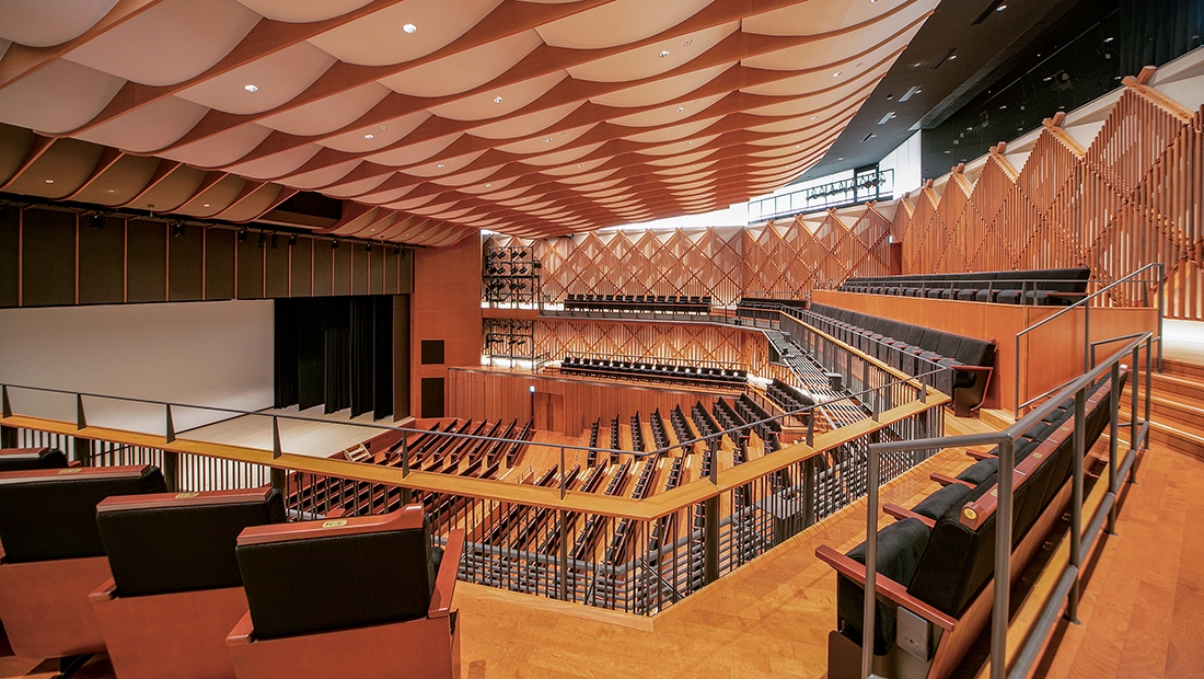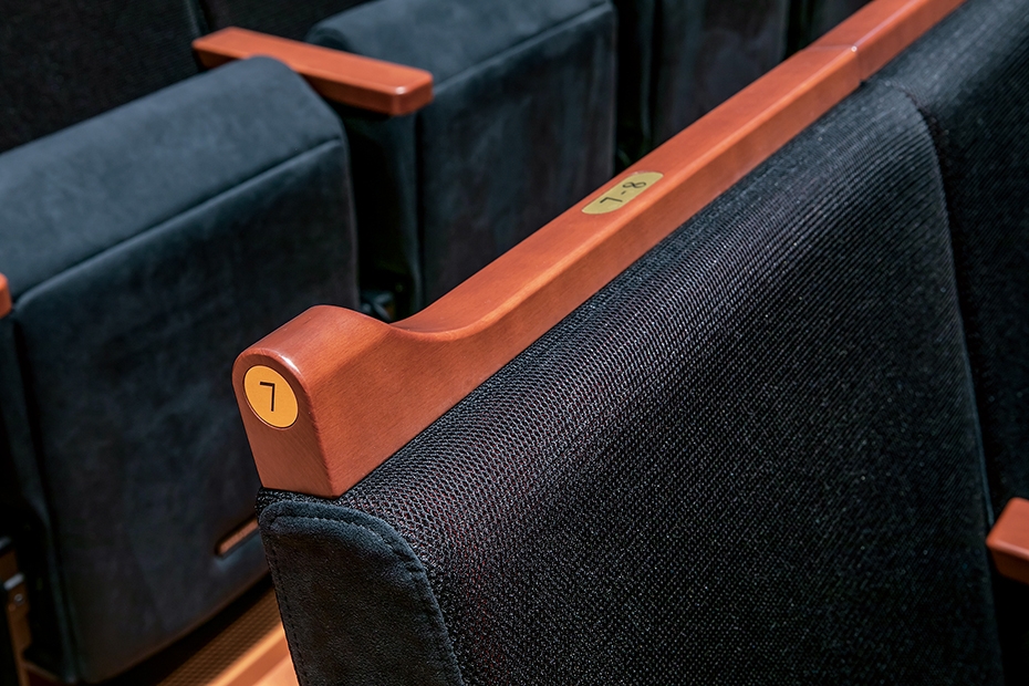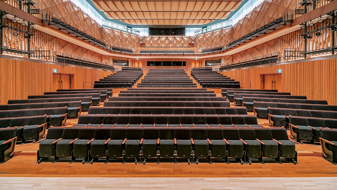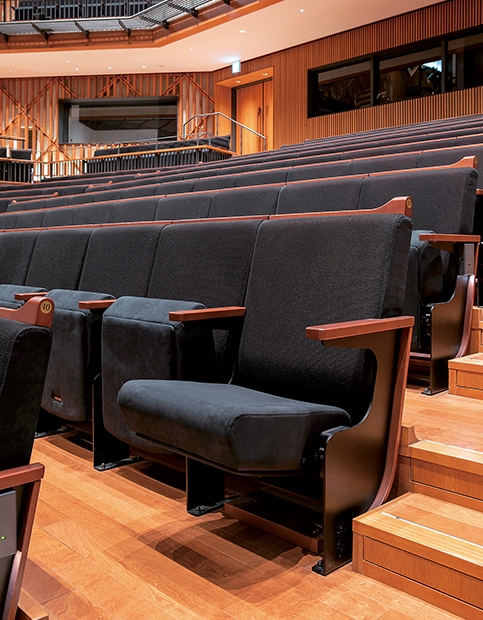 音楽を主目的とするホールには、延岡市産材が壁面や舞台に活用されており、音を豊かに広げる効果を持つとともに、木の温もりに包まれる空間となっています。また客席の張地には、グラデーションのプリントを施した席がランダムに配置されており、延岡の風物詩である「流れ灌頂(かんじょう)」の風景を彷彿させる意匠となっています。