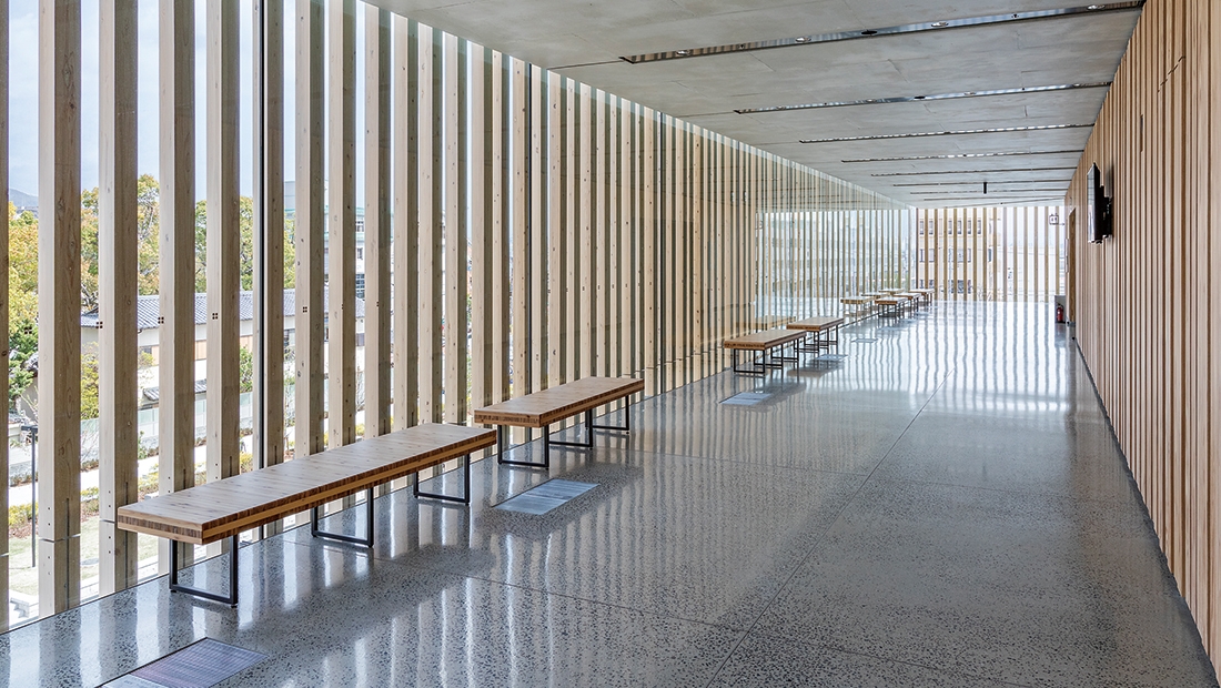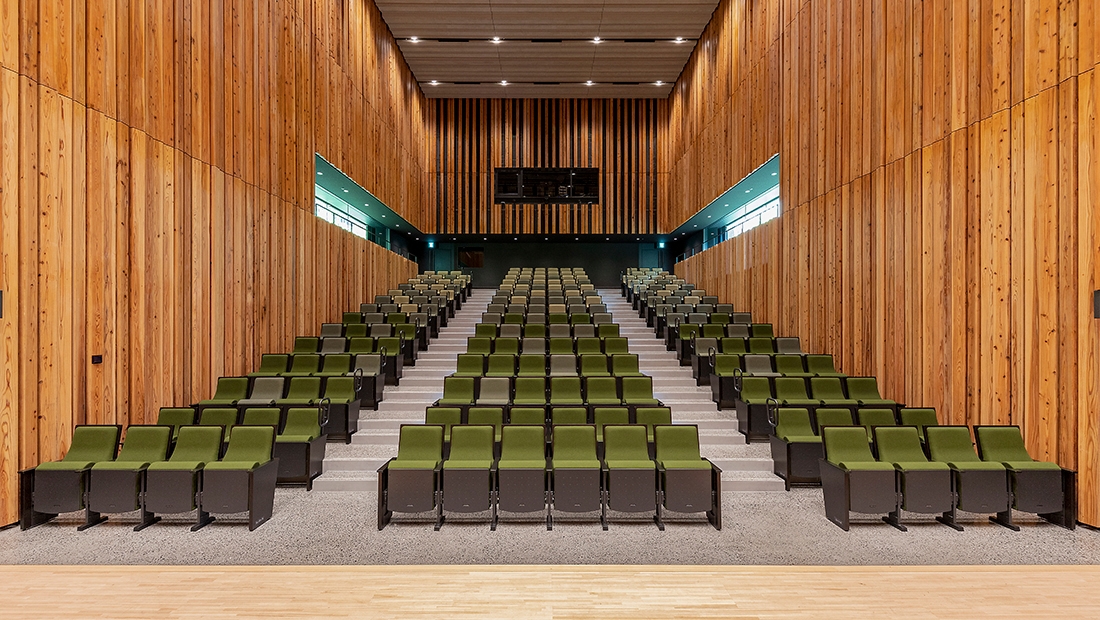 205席の小ホール「太陽ファルマテックホール」は、小規模コンサートや舞台公演での活用が想定されており、木の壁面に囲まれた空間に、サイドバルコニー越しの庭のグリーンが美しく映える内装となっています。