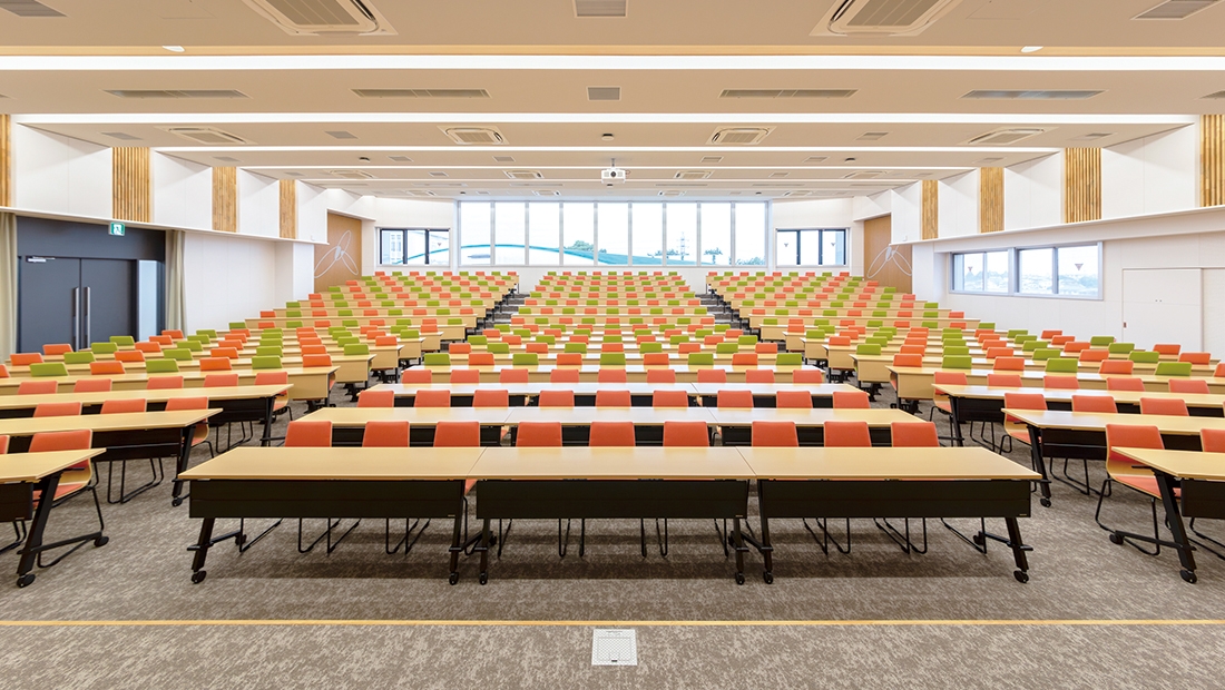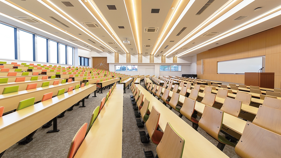 さくら講堂/講義デスク・イス:ラッセ、移動イス:PWS4、移動デスク:CTZ、演台:LST-30