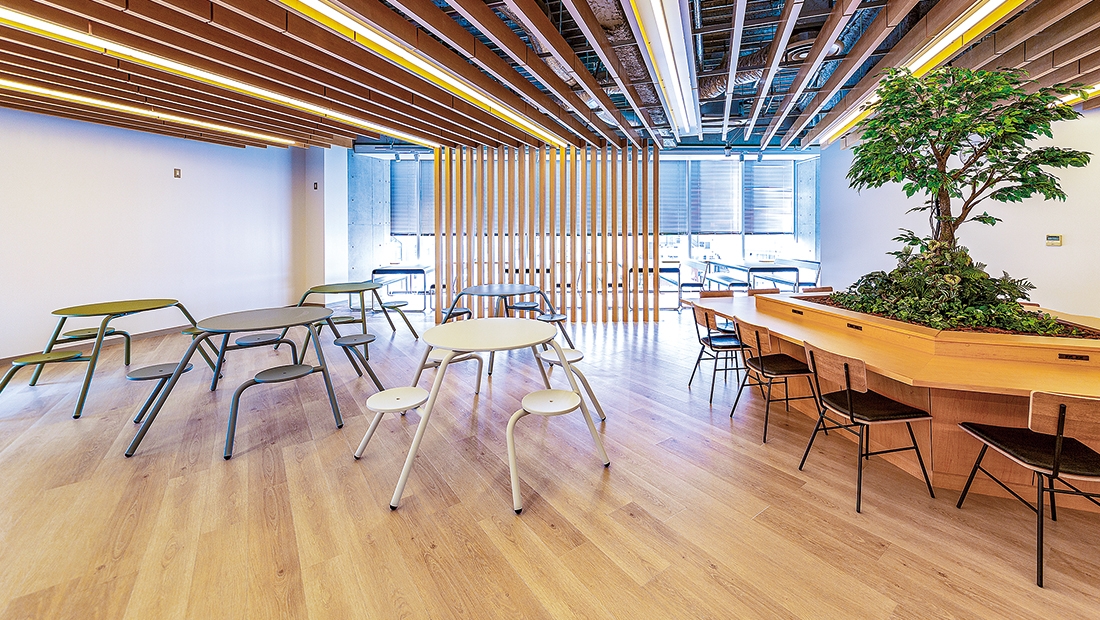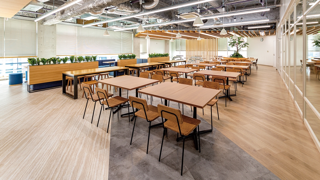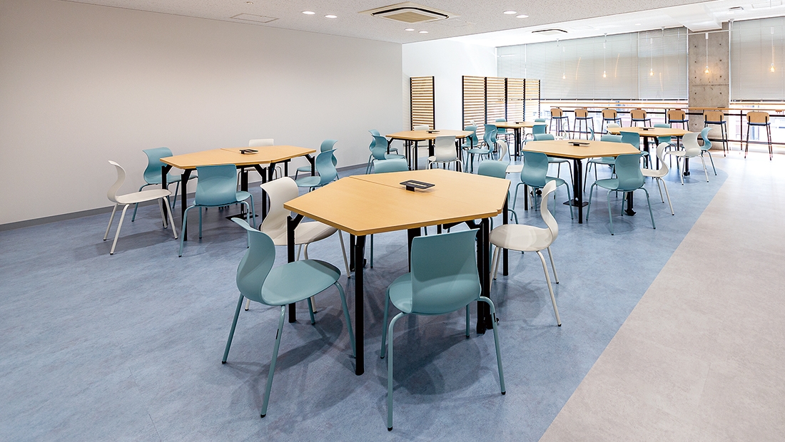 リニューアルした食堂は、空のイメージであるブルーをアクセントカラーとし、内装には木目調や植栽を取り入れた落ち着いた空間となっています。明るく開放感のある食事スペースをはじめ、屋外にいるようなアウトドアラウンジ、グループで利用可能なソファラウンジ、1人でも利用しやすいカフェカウンターやカフェブースなど、学生のさまざまなニーズに応えられる食堂へと生まれ変わりました。