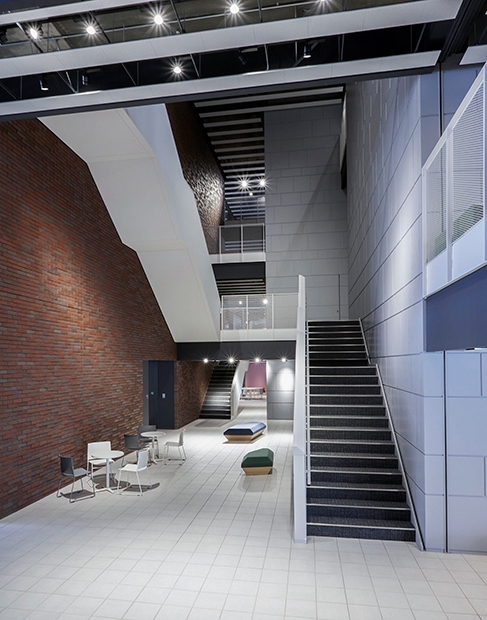 三角形という特色ある形の新校舎には、廊下はなく自由で開放的な大小さまざまな空間が広がっています。その空間にはさまざまな種類のイス、テーブルが置かれ、生徒が自由に学習できるスペースとなっており、「主体的に学ぶ」という同校のコンセプトが体現されています。