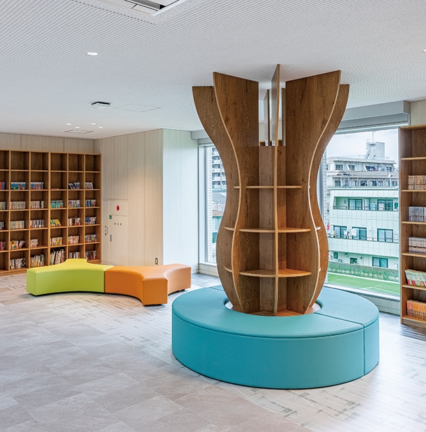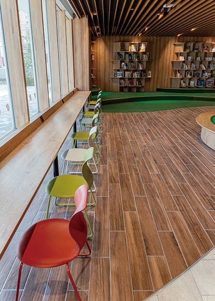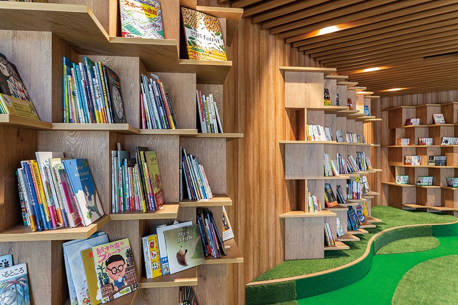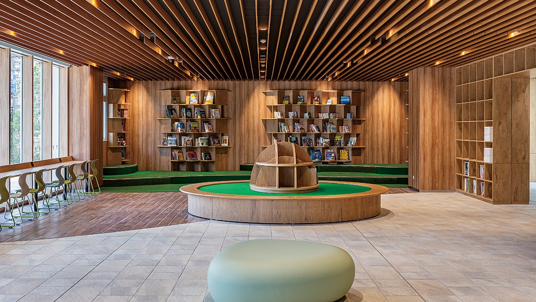 ライブラリーラウンジ/イス:プロ、ソファ:ペブル、カウンターテーブル、壁面書架、円形書架、円形ステージ、書籍、内装(壁面装飾、人工芝)